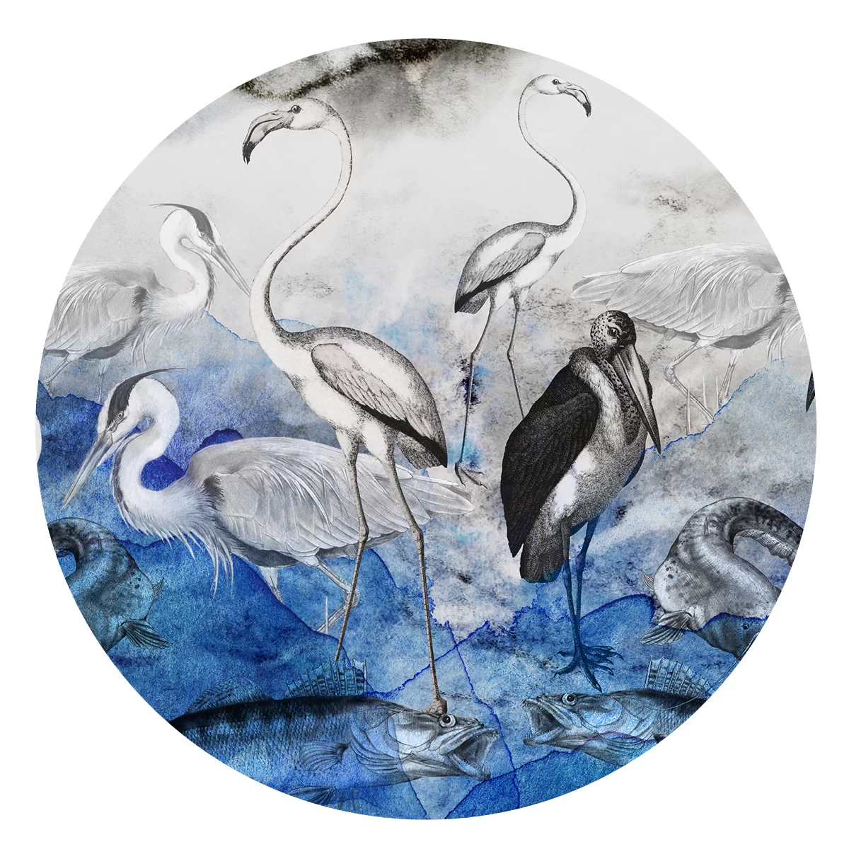 Dekoracje na ścianę w formie okrągłego muralu o średnicy 130 cm. Dekoracje ścienne Dots są wykonane z materiału samoprzylepnego o strukturze płótna ALVAR LINEN.