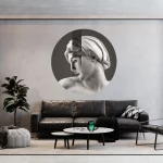 Dekoracje na ścianę w formie okrągłego muralu o średnicy 130 cm. Dekoracje ścienne Dots są wykonane z materiału samoprzylepnego o strukturze płótna ALVAR LINEN.