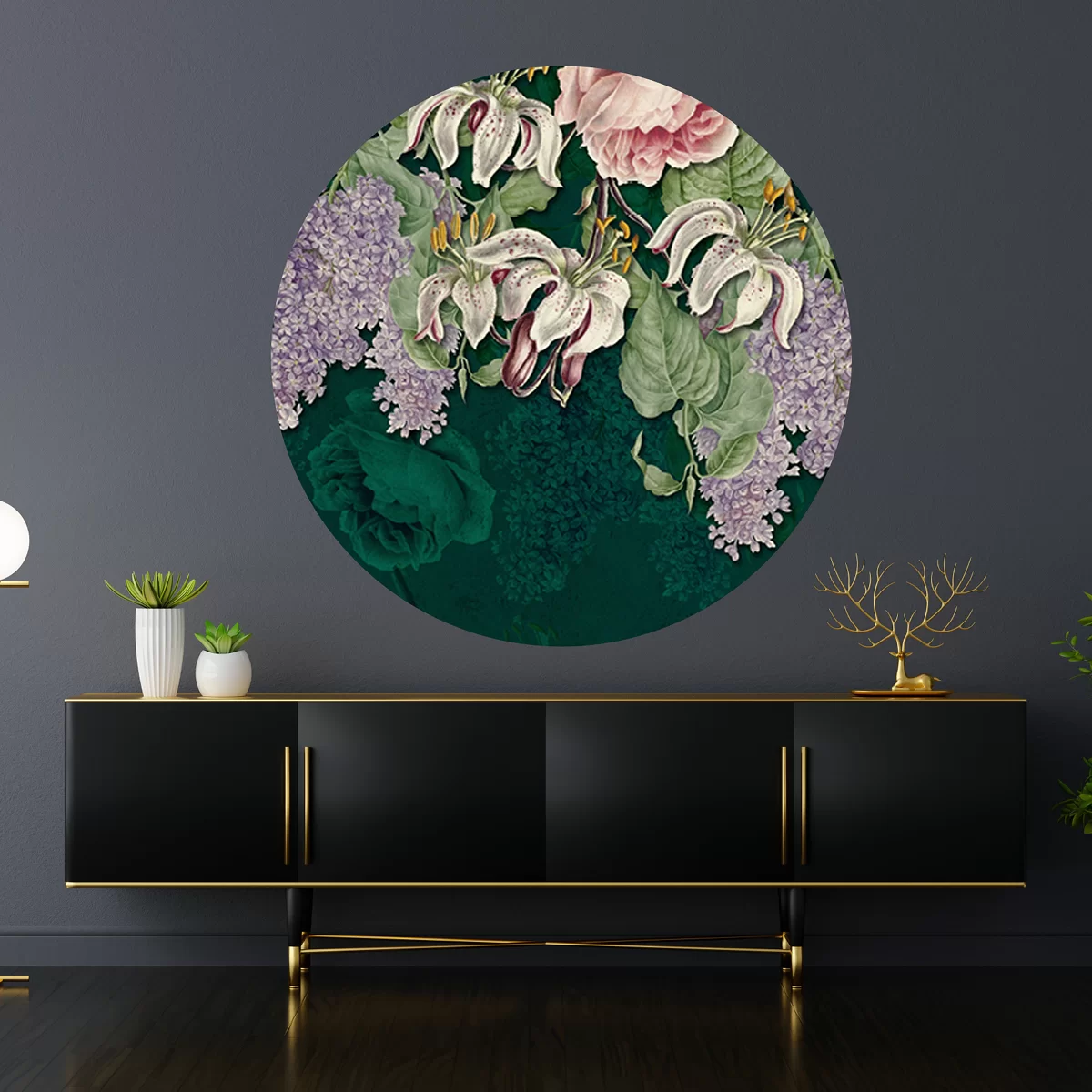 Dekoracje na ścianę w formie okrągłego muralu o średnicy 130 cm. Dekoracje ścienne Dots są wykonane z materiału samoprzylepnego o strukturze płótna ALVAR LINEN.
