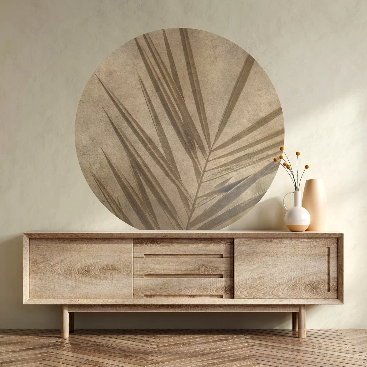 Dekoracje na ścianę w formie okrągłego muralu o średnicy 130 cm. Dekoracje ścienne Dots są wykonane z materiału samoprzylepnego o strukturze płótna ALVAR LINEN.
