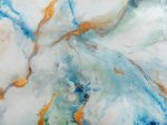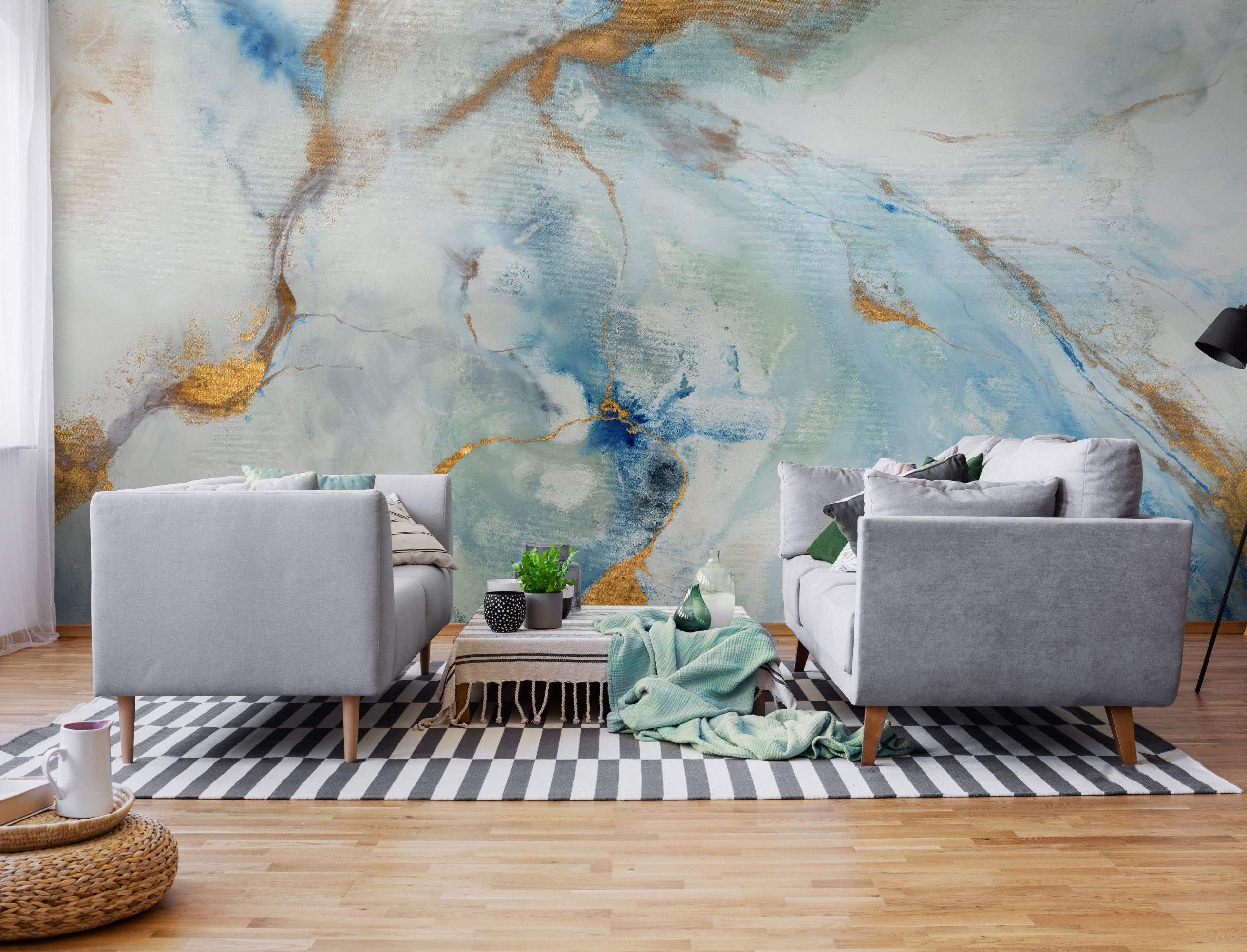 Tapeta Dreamstone to duży panel ścienny, który przekształca wnętrze w galerię sztuki. Jego abstrakcyjny wzór łączy eteryczne przejścia błękitów i turkusów z czystą bielą. Wygląda to jak mgiełka piany na wodzie, a złote „żyły” przywołują na myśl kintsugi oraz szlachetne żyłkowanie marmuru czy agatu. Brak klasycznego raportu sprawia, że ściana staje się jednolitym, imponującym obrazem.