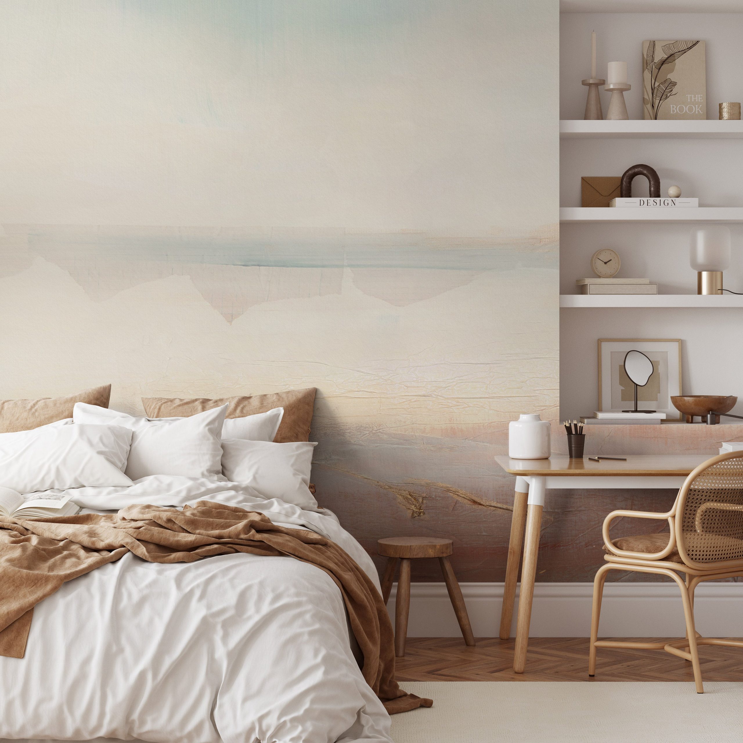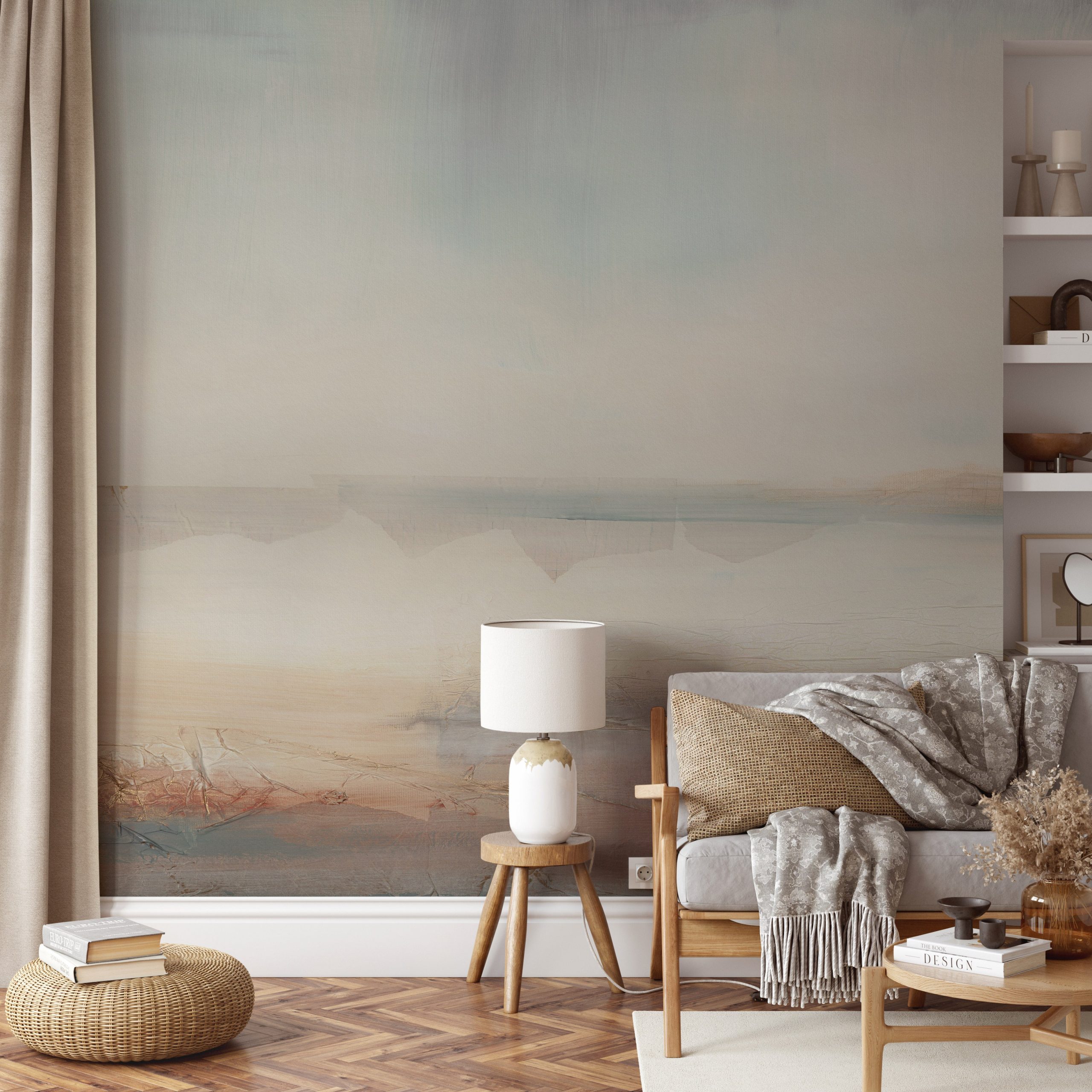 To nie jest zwykły deseń – to ciągły mural. Jego kompozycja rozwija się na całej szerokości ściany, bez widocznych łączeń. Abstrakcyjny ekspresjonizm łączy się z pejzażową poetyką: miękkie przejścia tonalne oraz warstwowe laserunki tworzą wrażenie otwartej przestrzeni, sprzyjającej kontemplacji. Dzięki temu pokój wydaje się większy, a aranżacja bardziej spokojna. Tapeta stanowi neutralne, lecz eleganckie tło dla mebli, sztuki i oświetlenia.