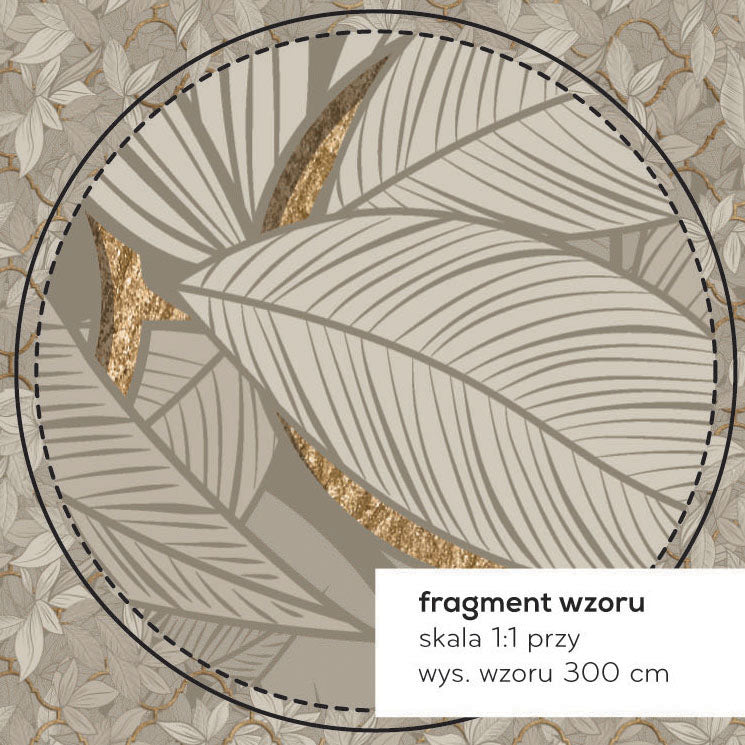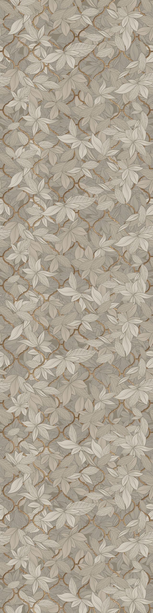 Tapeta Edera Beige to definicja nowoczesnej elegancji, opartej na stonowanej, subtelnej luksusowości oraz harmonii. Na neutralnym tle ciepłych szarości i beżów rozkwita botaniczny wzór stylizowanych liści, uzupełniony delikatną arabeską w odcieniach mosiądzu. Regularny, płynny rytm wzoru dodaje ścianie głębi, a jednocześnie nie przytłacza. Wnosi do wnętrza atmosferę zacisznego ogrodu, łącząc styl modern classic z nutą art déco.