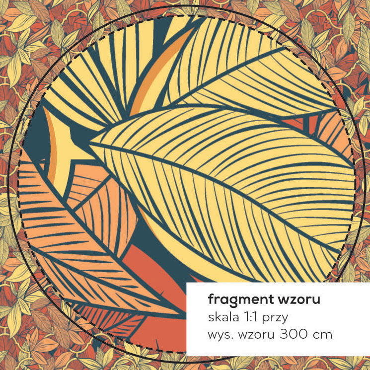 Urok tej tapety tkwi w harmonijnej palecie kolorów. Ciepłe rudości i złociste żółcie zestawione są z oliwkową i szmaragdową zielenią, co buduje głębię i tworzy miękki, otulający nastrój. Rytm wzoru jest płynny, co sprawia, że na ścianie nie widać łączeń. Całość emanuje kojącą, luksusową aurą, idealną do relaksu.