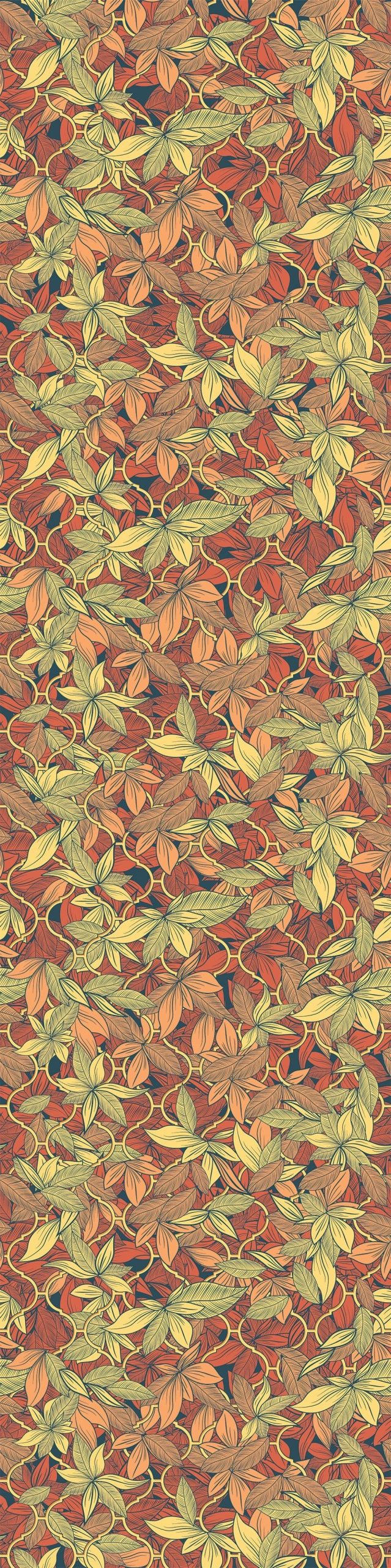 Tapeta Edera Rust to kwintesencja jesiennej elegancji. Gęsty, botaniczny gąszcz liści o ceglanych, rdzawych i złocistych tonach rozkłada się na głębokim, prawie granatowo‑turkusowym tle. Stylizowane kształty – od zaokrąglonych po liście o wyraźnych wypustkach – tworzą wysmakowaną kompozycję z subtelnym, geometrycznym podkładem przypominającym marokańską koniczynę. Ten secesyjny styl z nutą Arts & Crafts dodaje wnętrzu klasy i ponadczasowości.