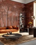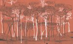 Tapeta Ember przedstawia klimatyczną kompozycję drzew, zarysowanych liniowo na ciepłym tle w kolorze terakoty. Mocny, głęboki kolor bazowy w połączeniu z graficznymi konturami tworzy wyrazisty, nowoczesny mural, który wprowadza do wnętrza charakter, ciepło i odrobinę tajemniczości.