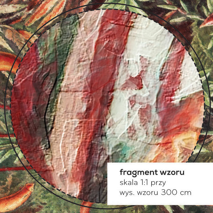To idealny wybór dla tych, którzy cenią artystyczny maksymalizm. Mieszkańcy docenią podwójny efekt: z daleka – spektakularną głębię i nastrojowość, z bliska – bogactwo detali oraz miękką, ilustracyjną kreskę. Zgaszone zielenie koją i otulają, podczas gdy intensywne czerwienie dodają energii, tworząc wyrafinowany rytm kolorów.
