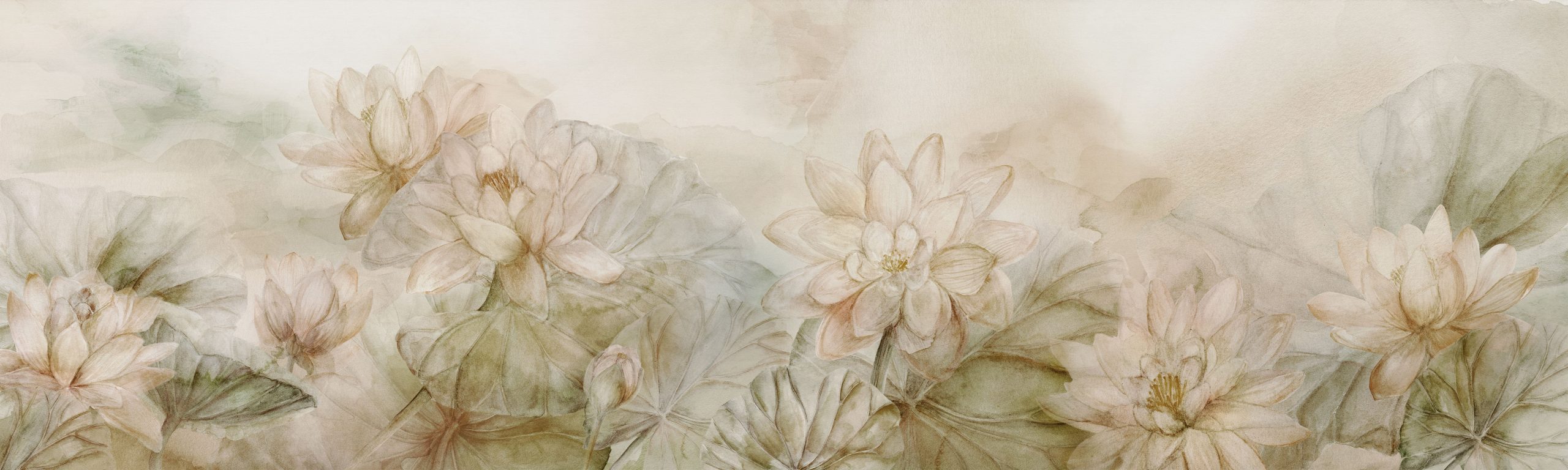 Tapeta Fall to mural wielkoformatowy, który wprowadza do wnętrza świeżość natury. Na jasnym, kremowo-beżowym tle pojawiają się stylizowane kwiaty lotosu oraz liście malowane akwarelami. Pastelowa paleta kolorów — przydymione zielenie, oliwkowe odcienie i zgaszone kremy — tworzy spójną i kojącą kompozycję. Przypomina obraz stworzony światłem i wodą.