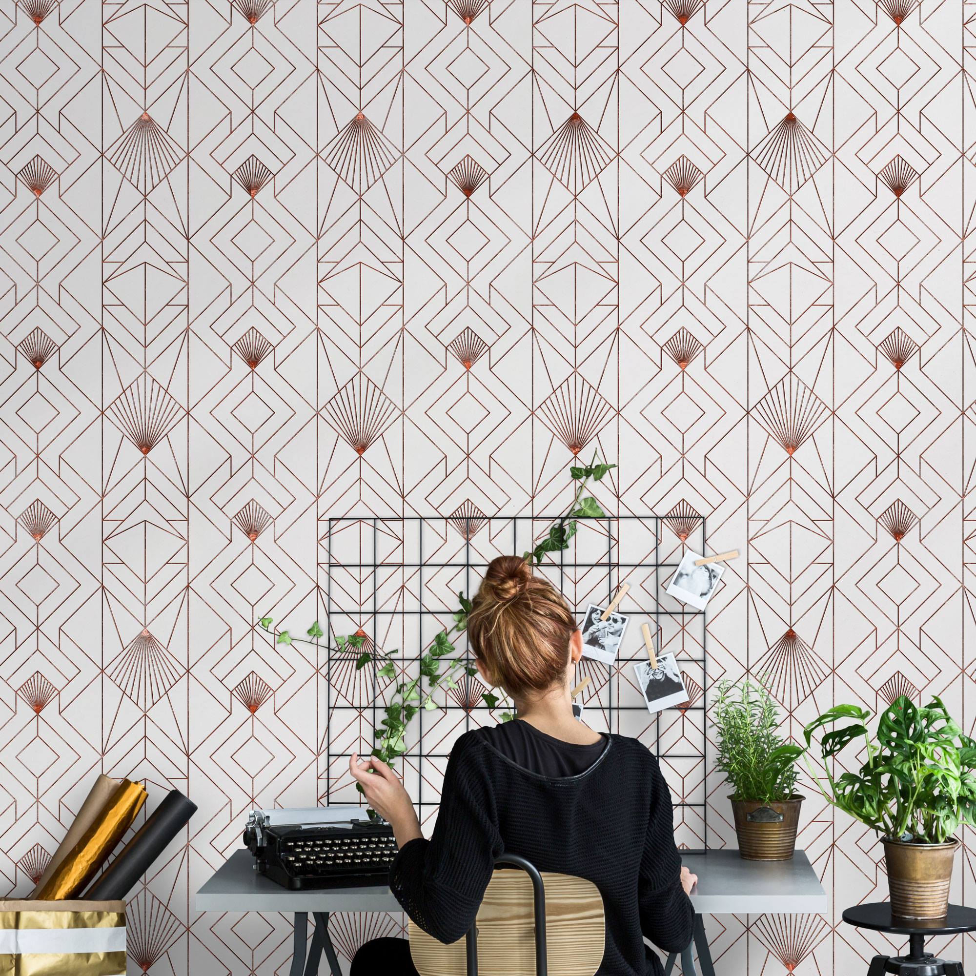 Gdy światło dotyka miedziano-różanych linii na ścianie, wnętrze zaczyna emanować nowoczesnym stylem Art Deco. Tapeta FAN Rosegold to elegancki ukłon w stronę lat 20. XX wieku, przeniesiony do współczesności. Czyste, białe tło rozjaśnia przestrzeń, a geometryczne wzory wachlarzy, rombów i promienistych linii tworzą elegancki rytm.