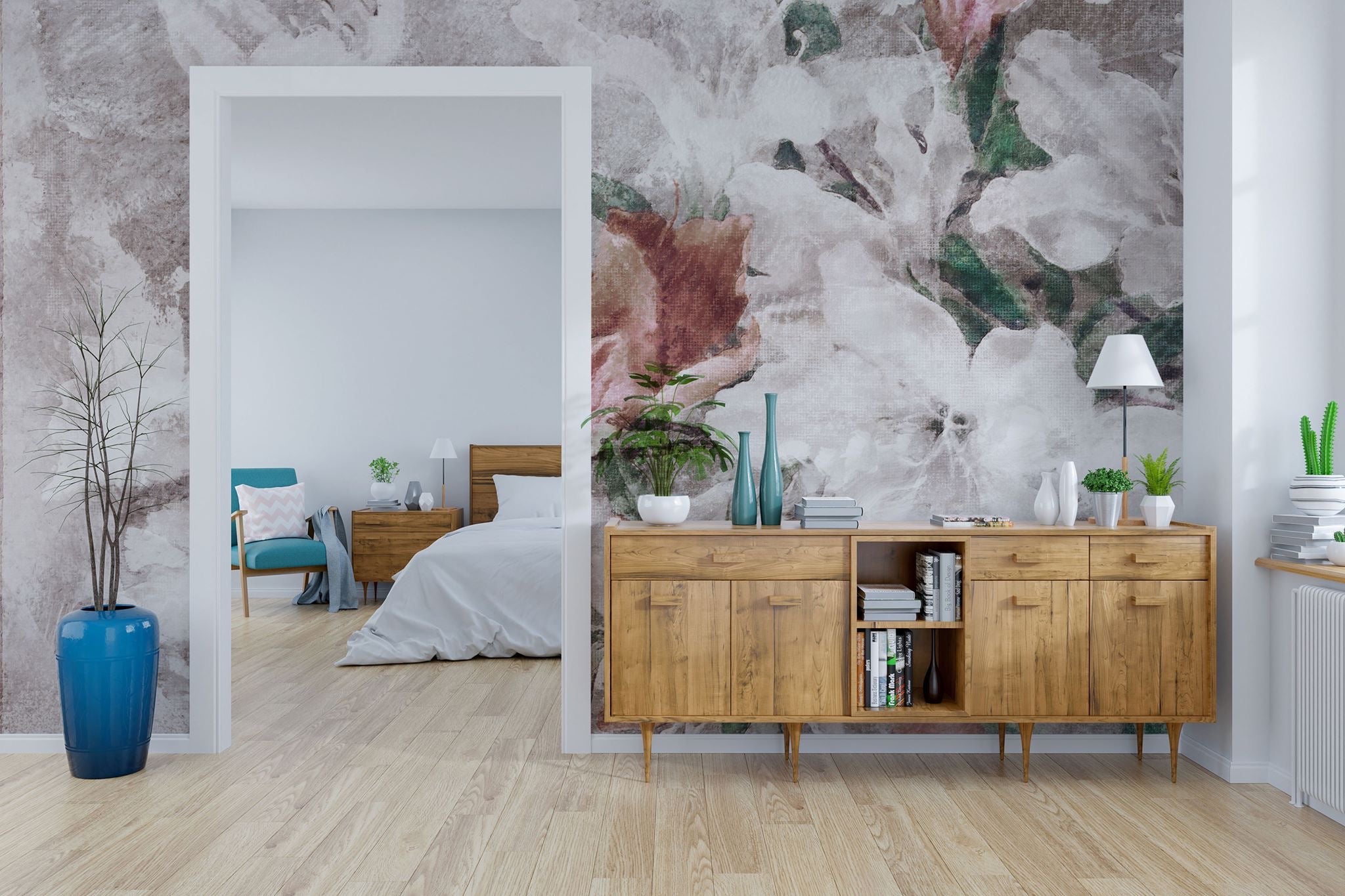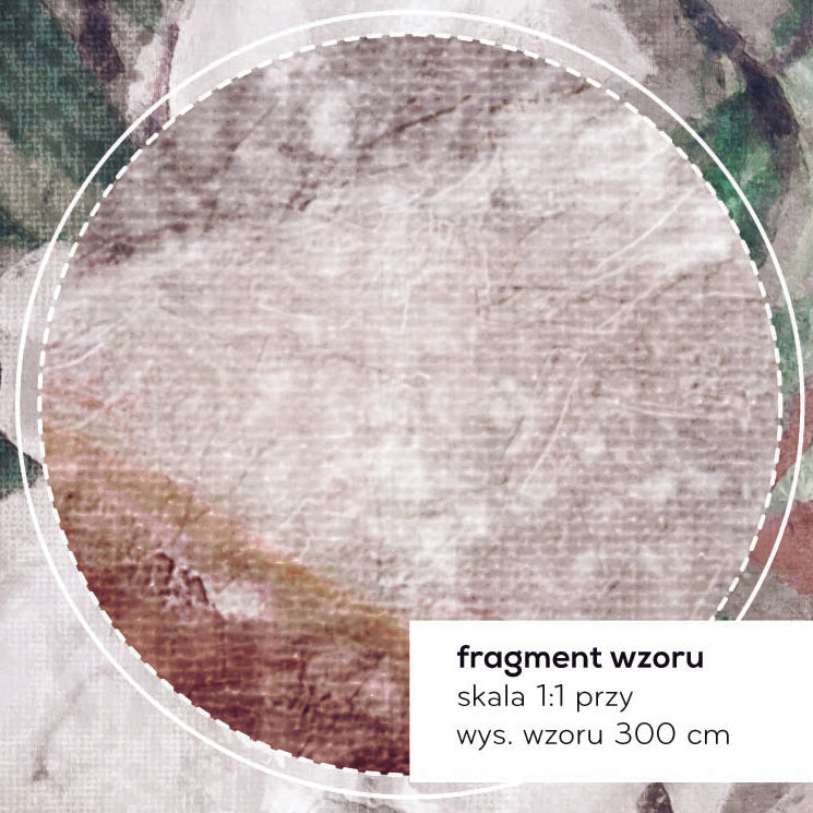 Wyobraź sobie ścianę, która zmienia się w obraz – w subtelnie postarzaną kompozycję, gdzie światło i cień łagodnie modelują płatki kwiatów. Tapeta Gloria to wielkoformatowy mural artystyczny, stworzony w naturalnej i stonowanej palecie kolorów. Szaro-brązowe tło, przypominające płótno, z delikatnymi przetarciami, kontrastuje z bujnymi kwiatami w odcieniach kremu, złamanej bieli, pudrowego różu i terakoty. Całość uzupełniają liście w tonach butelkowej zieleni, oliwki oraz przygaszonego turkusu, co tworzy harmonijną i kojącą atmosferę.