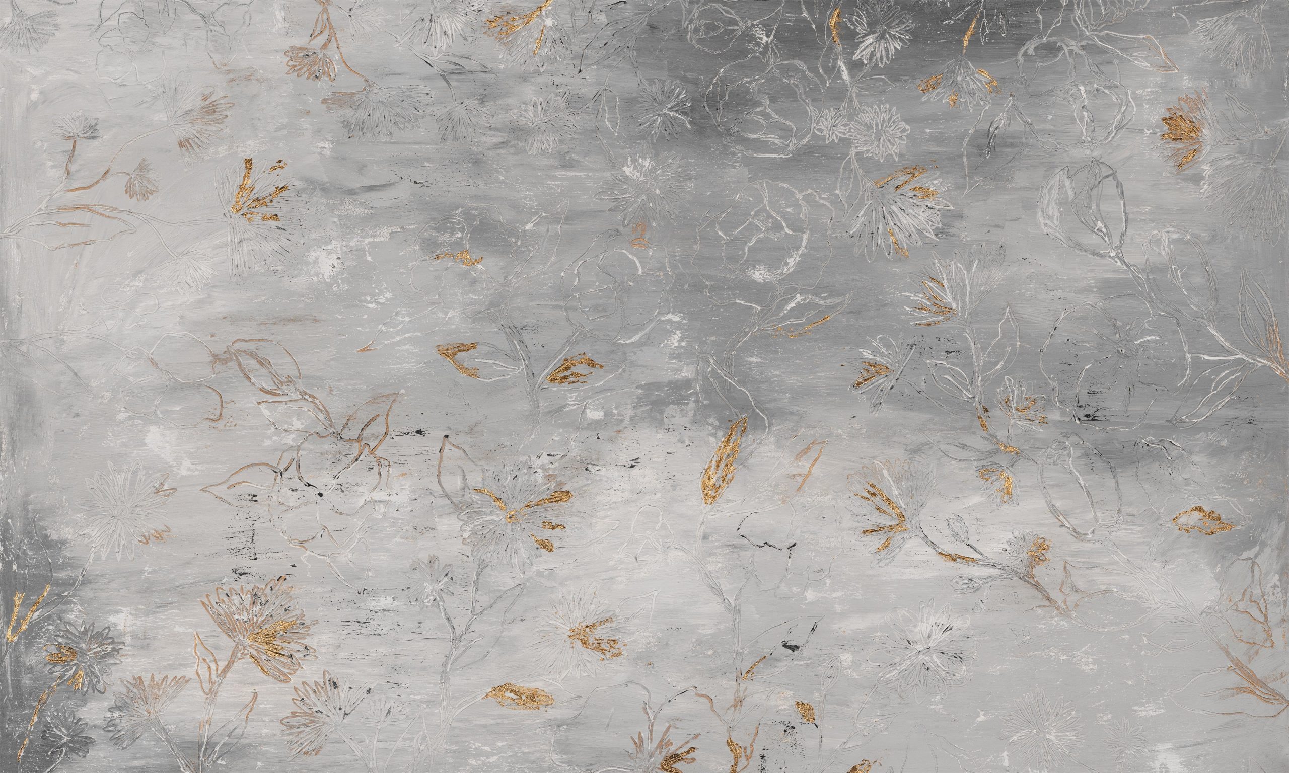 Tapeta Grati to wyjątkowy element, który łączy sztukę z architekturą. Na tle głębokiego, cementowego szarości rozwijają się stylizowane liście i kwiaty. Te wzory są uproszczone, jak malowane grubą warstwą farby, a nieregularne, świetliste smugi złota przywodzą na myśl kintsugi. Co z tego wynika? Współczesny, botaniczny motyw o muralowym charakterze, elegancki i niespotykany.