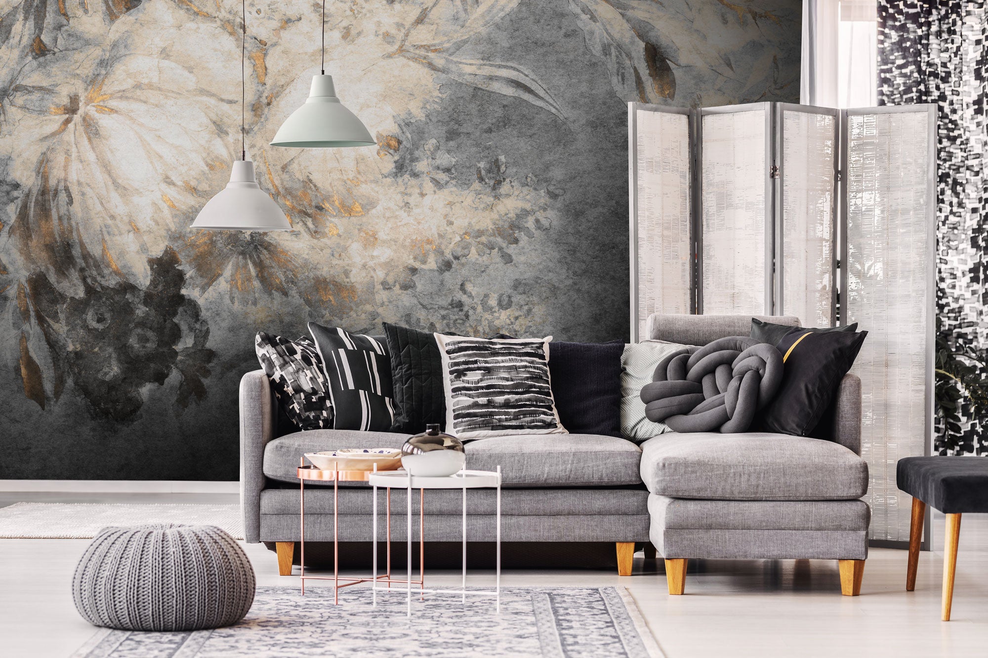 Tapeta o bezpowtórzeniowym, muralowym wzorze inspirowanym sztuką XVIII wieku; delikatne przejścia szarości, beżu i złota, matowe wykończenie, eleganckie tło, które powiększa i nadaje luksusowy klimat.