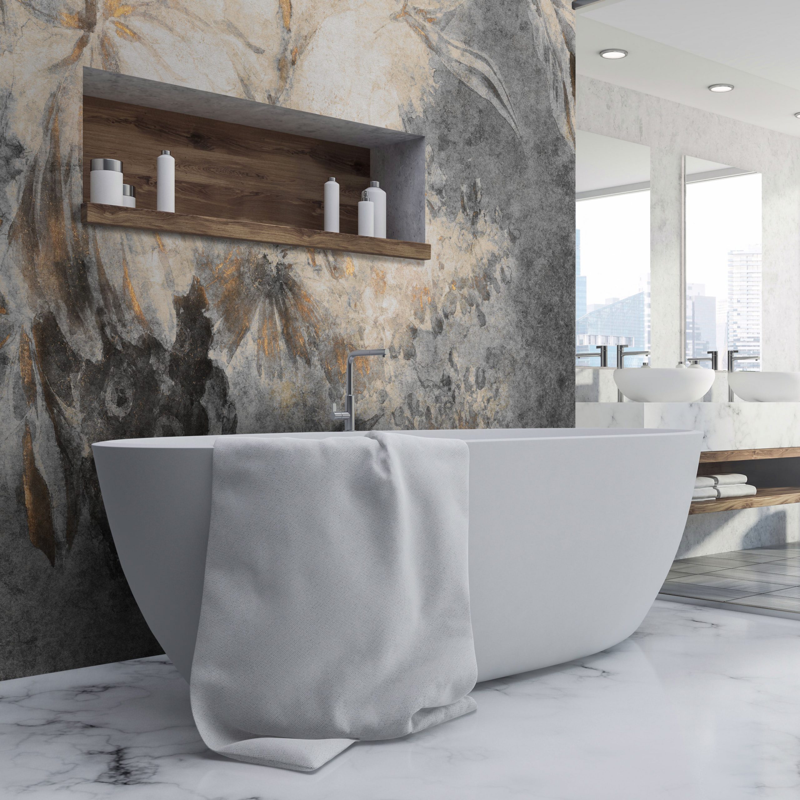 Wzór z kolekcji Nature inspirowany wielką sztuką. Harmony jest reprodukcją obrazu holenderskiego malarza z XVIII wieku. Harmonijne połączenie kwiatów w kolorach beżu, kremu i szarości, na cieniowanym szarym tle, z elementami dekoracyjnymi w barwach złota, tworzy piękną kompozycję. Bogaty i zdobny wzór będzie idealną ozdobą wnętrz minimalistycznych oraz klasycznych. Świetnie sprawdza się w projektach każdej przestrzeni od kuchni, poprzez łazienki, salony, sypialnie, klatki schodowe czy przestrzenie komercyjne.