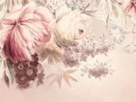 Tapeta Harmony Earth to mural, który przynosi do wnętrza relaksujący klimat romantycznego ogrodu. Na jasnym, kremowo-beżowym tle, przypominającym szlachetny, spatynowany papier, rozkwitają powiększone kompozycje piwonii i róż. Malarskie pociągnięcia pędzla oraz akwarelowe rozmycia składają się w bujne, ale schludne przedstawienie. Widzimy tutaj pudrowe róże, stonowane czerwienie i bordo w metalicznych odcieniach płatków, a także muśnięcia brązów i szarości z fiołkowym akcentem oraz ledwie zauważalną zielenią. Paleta kolorów jest pastelowa, a jej „wyblakły” charakter nadaje całości szlachetny, vintage’owy styl.