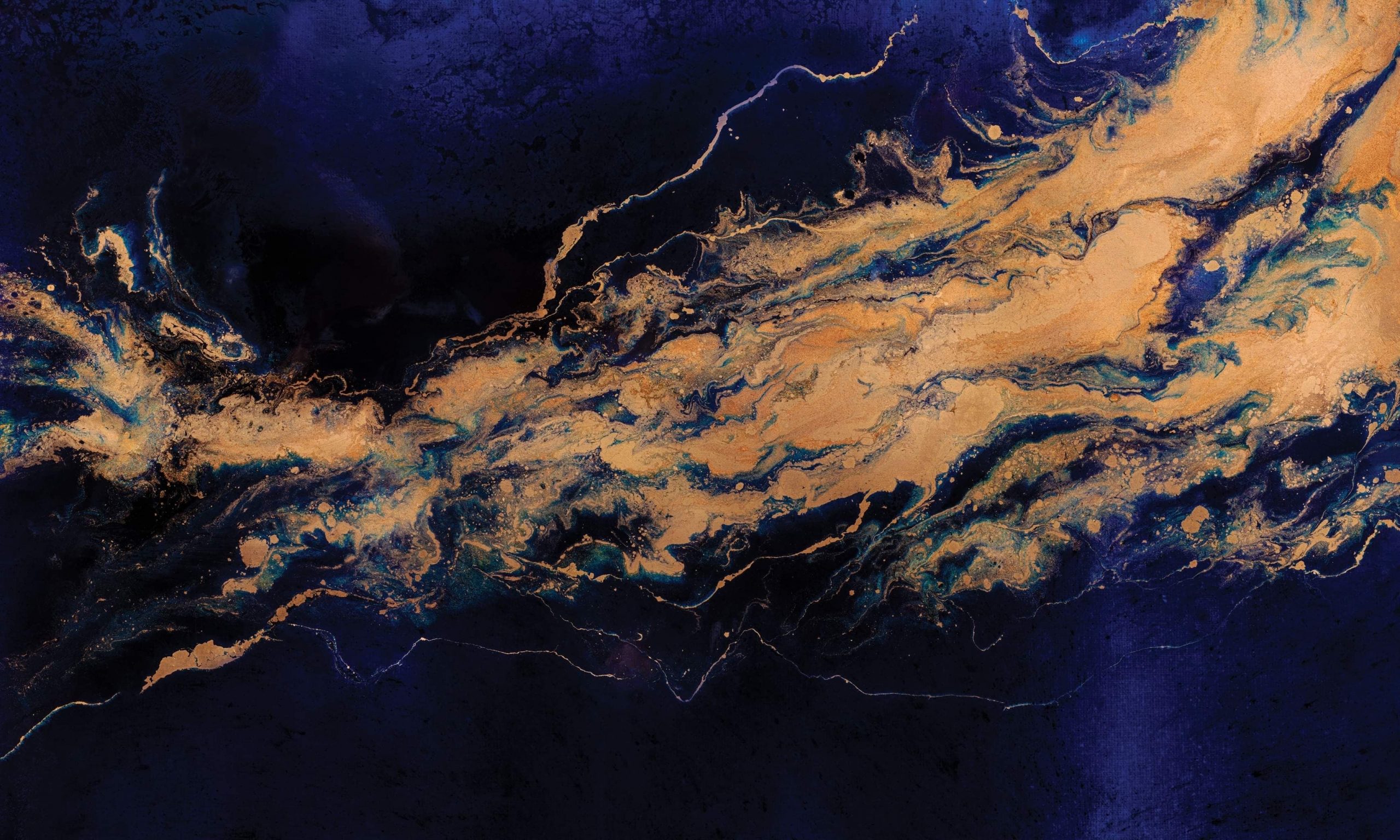 Tapeta Hypnos to zachwycający, wielkoformatowy mural, który przemienia ścianę w prawdziwe dzieło sztuki. Głęboki granat przechodzi od bliskiego czerni do szafirowych i elektryzujących błękitów. Świetliste miodowe tony złota wchodzą w kompozycję niczym żywica, tworząc kontrasty oraz wrażenie ruchu. Subtelne przejścia turkusu i szarości, a także delikatne, jasne „żyłki” wzmacniają wrażenie głębi i nadają całości wyrafinowaną, mineralną elegancję – przypominającą przekrój lapis lazuli z inkluzjami pirytu.