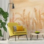 Impresjonistyczny mural z kłosami zbóż w beżowej palecie tworzy kojący, naturalny klimat w salonie i sypialni. Tekstury: linen/brush/stucco/craft; łatwa aplikacja....