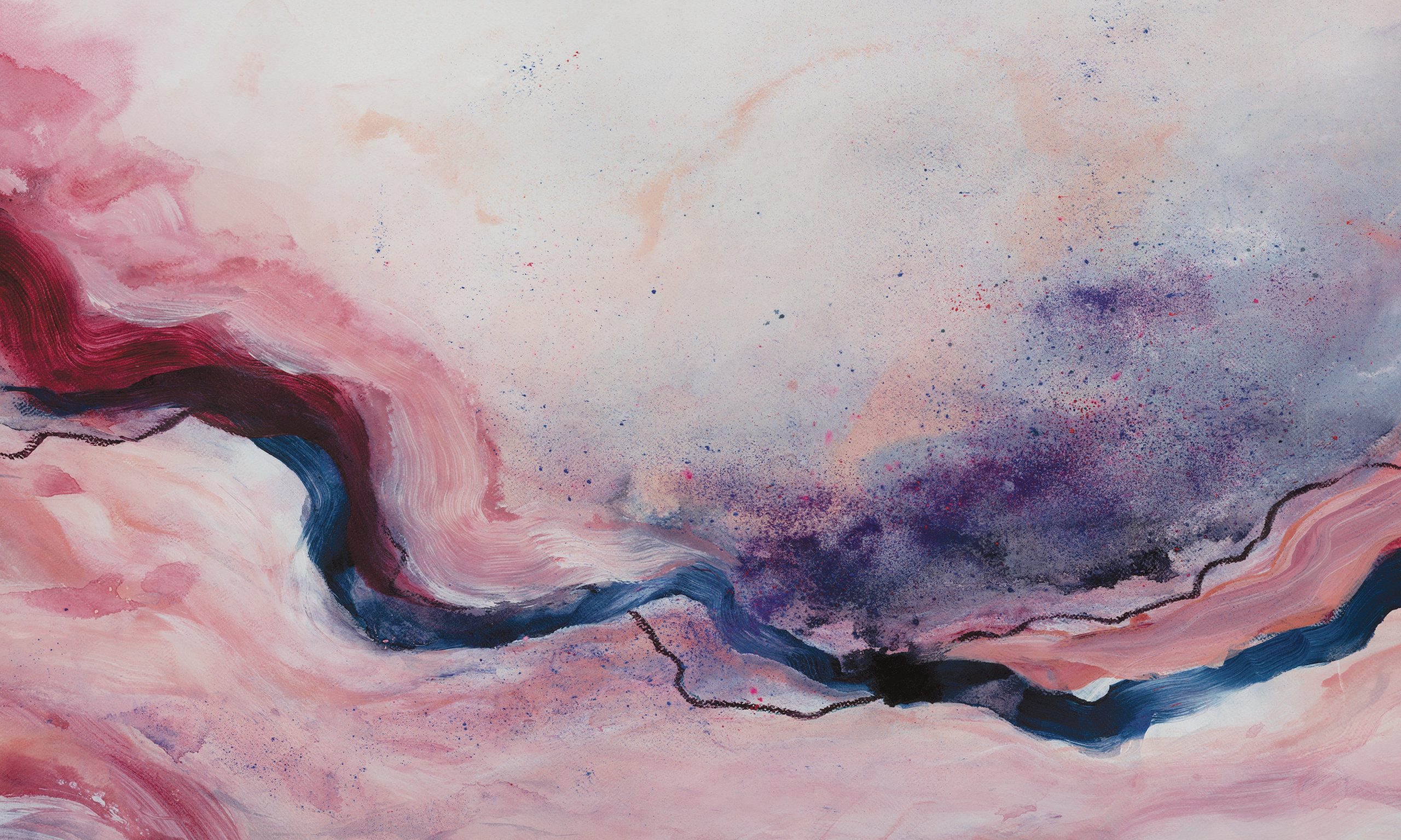 Abstrakcyjna tapeta o ręcznie malowanym charakterze, w palecie różu, granatu i burgundu; muralowy efekt, artystyczny akcent do nowoczesnych wnętrz. Na wymiar; winylowe i samoprzylepne.