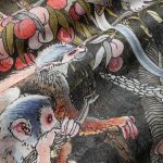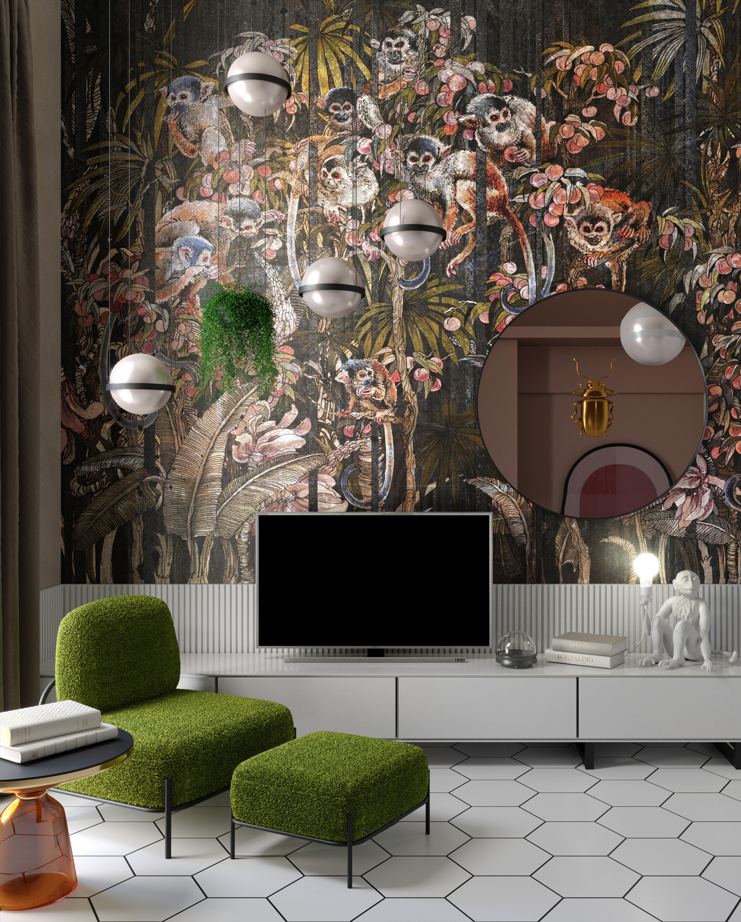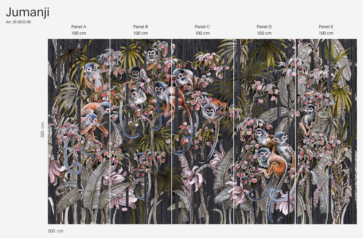 W centrum tego projektu znajdują się bujne, tropikalne liście i rośliny, które dodają świeżości oraz egzotycznego klimatu. Wśród zieleni ukazują się dynamiczne sylwetki małp, które wprowadzają ruch i życie. Kolory to prawdziwa feeria odcieni zieleni, połączona z subtelnymi brązami i beżami. Są tu też żywe akcenty pomarańczu, błękitu i fioletu, które ożywiają całość.