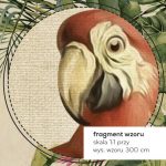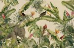 Jedno spojrzenie i przenosisz się do serca tropikalnego lasu. Tapeta Jungle tworzy panoramiczną, muralową scenę, gdzie bujna zieleń bananowców, palm i monster wplata się w akwarelowe wizerunki ptaków. Znajdziesz tu jaskrawe papugi, dostojne tukany oraz białe kakadu. Na kremowo‑beżowym tle, które ma subtelny, płócienny charakter, pulsuje paleta zgaszonych zieleni, takich jak szmaragd, oliwka i szarozielony, przełamywana akcentami pomarańczy i czerwieni strelicji. W tle dostrzegasz delikatny zarys słonia, jakby szept opowieści o safari.