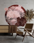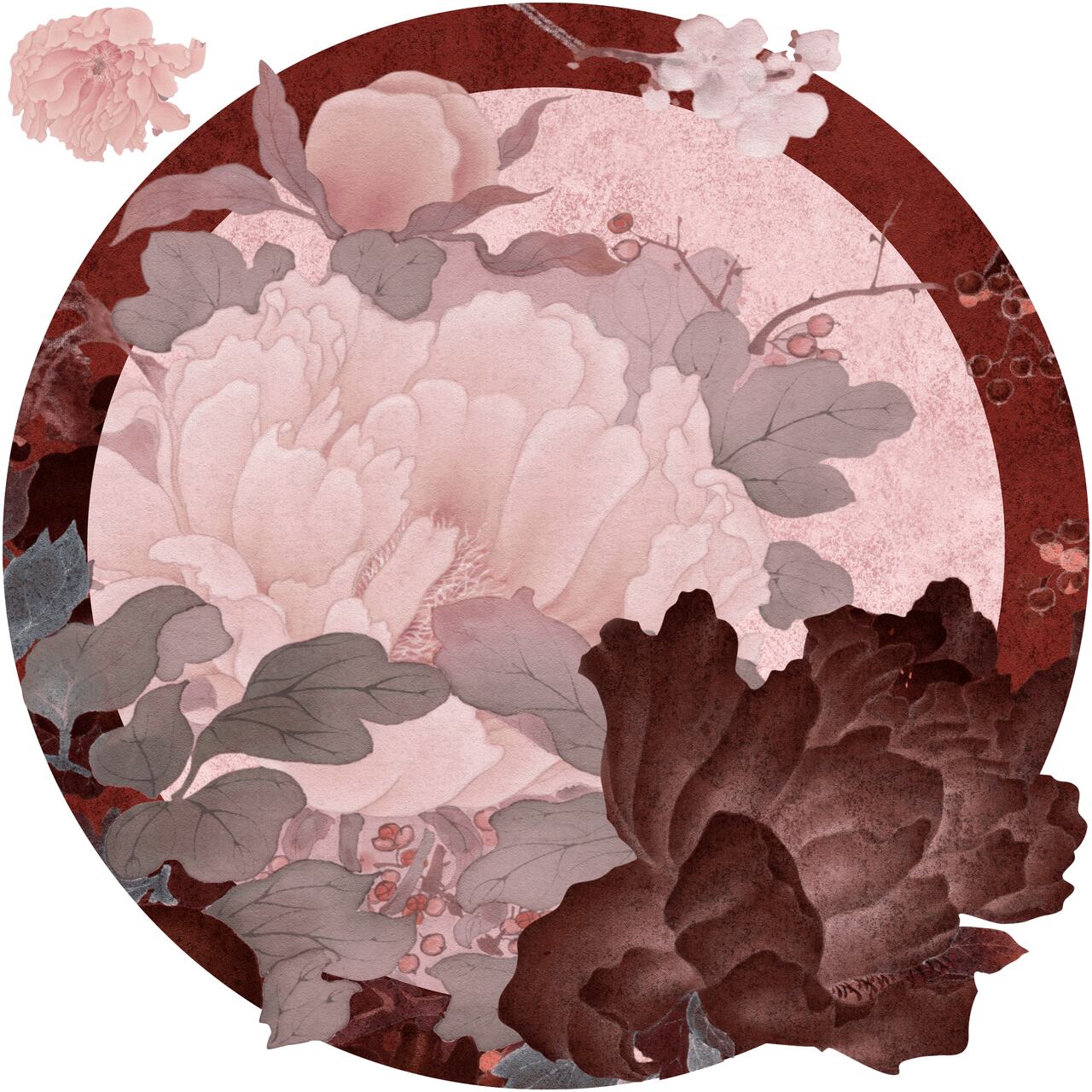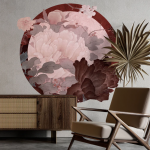 W centrum uwagi znajduje się bogata kompozycja piwonii w różnych fazach kwitnienia. Możemy dostrzec pudrowe i „brudne” róże, które przeplatają się z głębokim bordem oraz burgundem. Te kolory tworzą efektowny kontrast z czekoladowymi brązami oraz stonowaną zielenią i śliwkowymi liśćmi. Jaśniejsze, rozmyte tło wewnątrz okręgu oraz ciemnobordowa „rama” potęgują głębię i klarowność kompozycji.