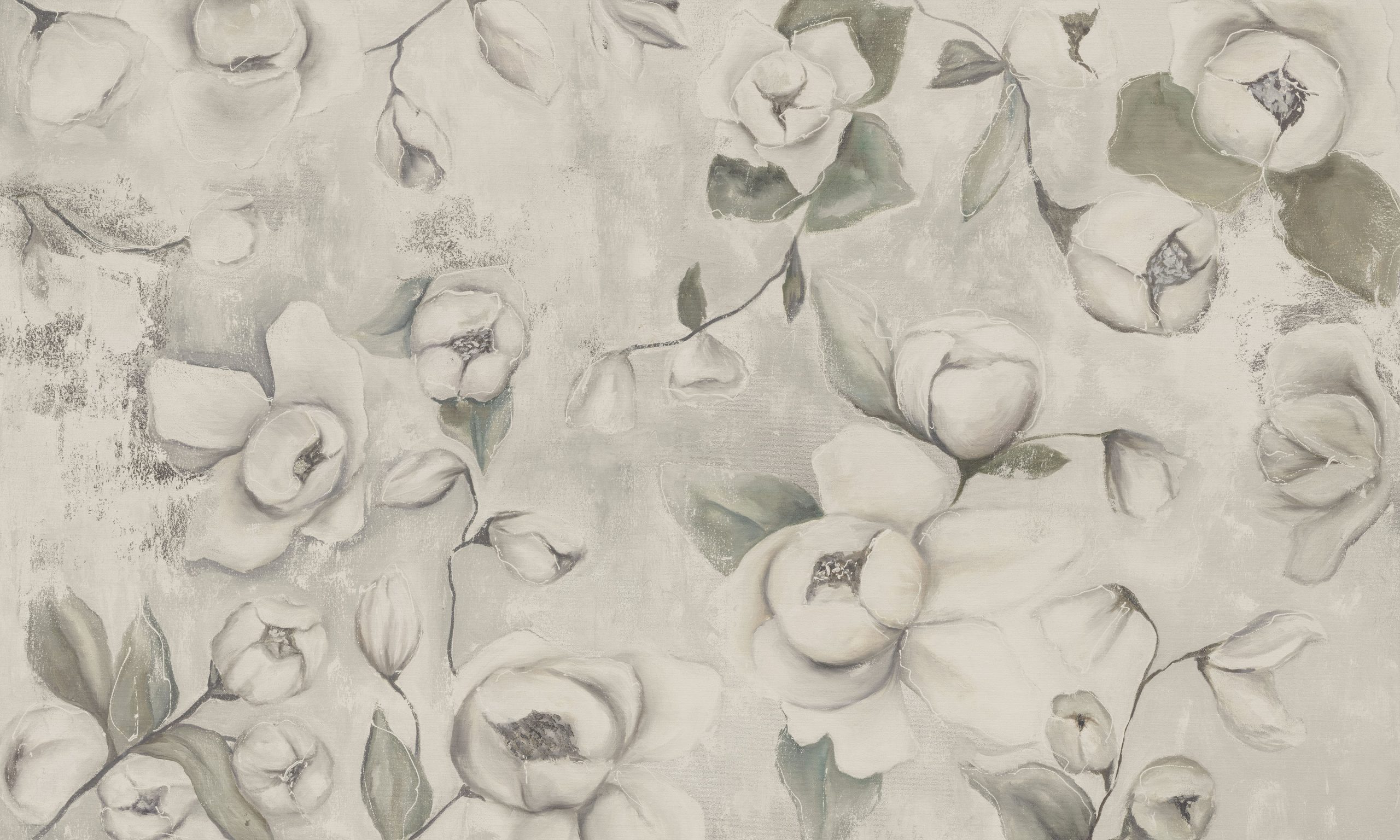 Duże, impresjonistyczne kwiaty, przypominające piwonie i magnolie, tworzą kompozycję muralu, a nie jedynie drobnego wzoru. Widoczne pociągnięcia pędzla, nieregularna tekstura oraz wyważony rytm motywu nadają ścianie szlachetny, artystyczny wyraz. To wzór, który koi i wycisza, a zarazem nadaje aranżacji indywidualny charakter.