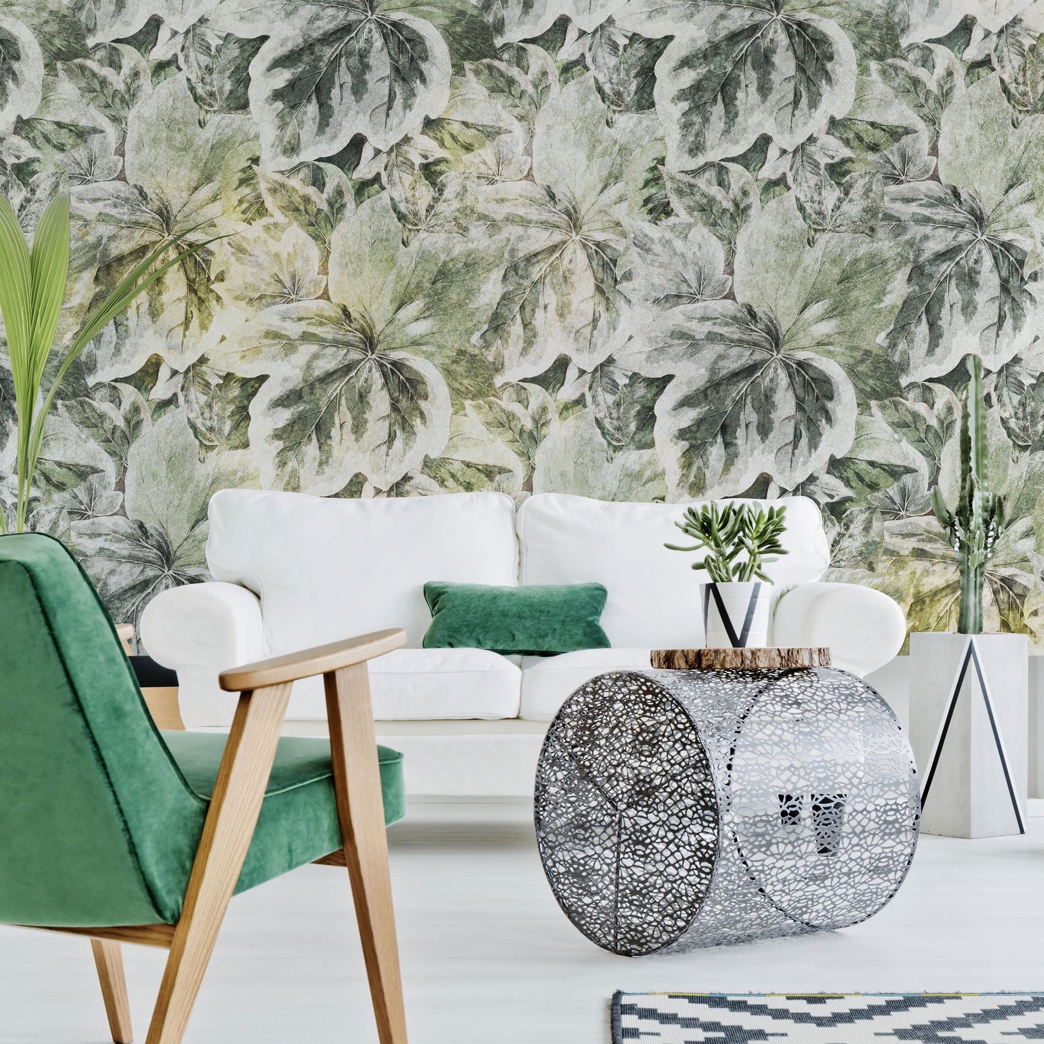 Tapeta Lierre to zielona kaskada, która zamienia ścianę w tajemniczy, kojący ogród. Duże liście w odcieniach szałwii i głębokiej leśnej zieleni, z subtelnymi, niemal żółtawymi refleksami, tworzą gęstą, organiczną kompozycję. Delikatne „wybielenia” na brzegach liści oraz wyraźnie zarysowane nerwy nadają motywowi głębi i światła. Efekt? Zielony żywopłot z zaczarowanego ogrodu.