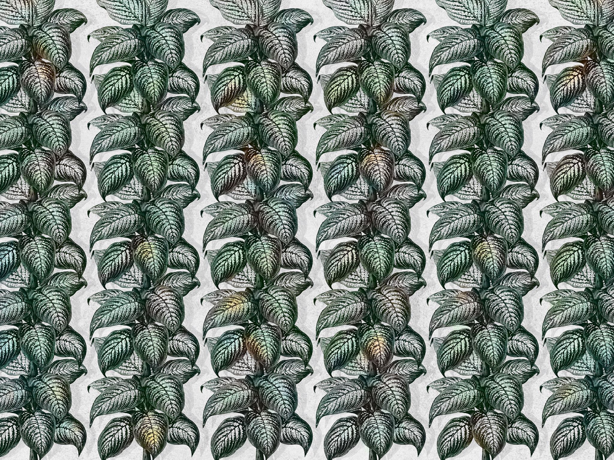 Tapeta Magnifica Light to połączenie tropikalnej świeżości z eleganckim, botanicznym stylem. Duże liście o głębokich zielonych konturach, wypełnione srebrzystobiałymi akcentami, tworzą nastrojową kompozycję. Przypominają one klasyczne ilustracje roślinne. Delikatnie przecierane tło w odcieniach złamanej bieli i jasnej szarości nadaje całości lekkości w stylu boho. To jakby połączenie bielonego drewna z subtelnym betonem.