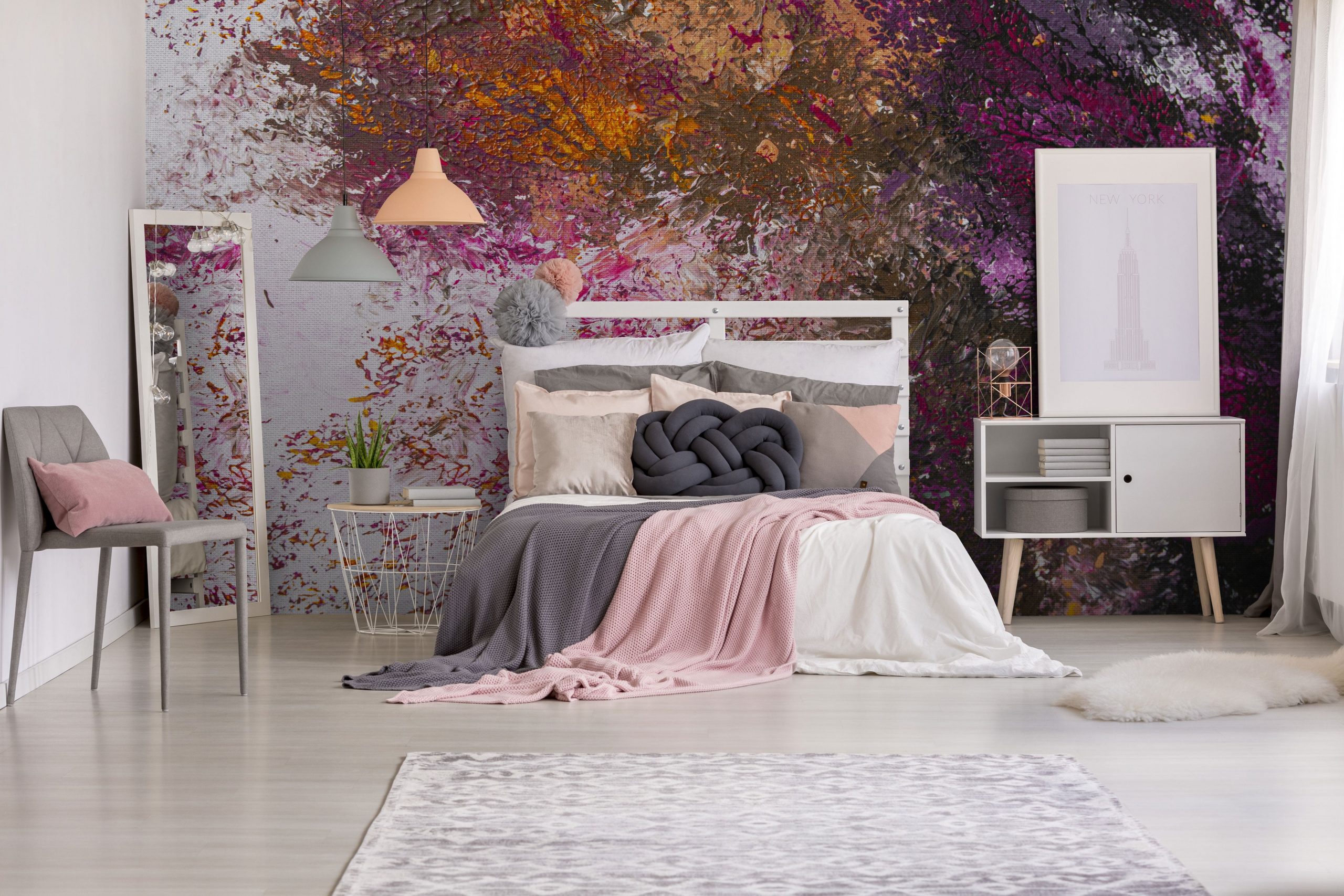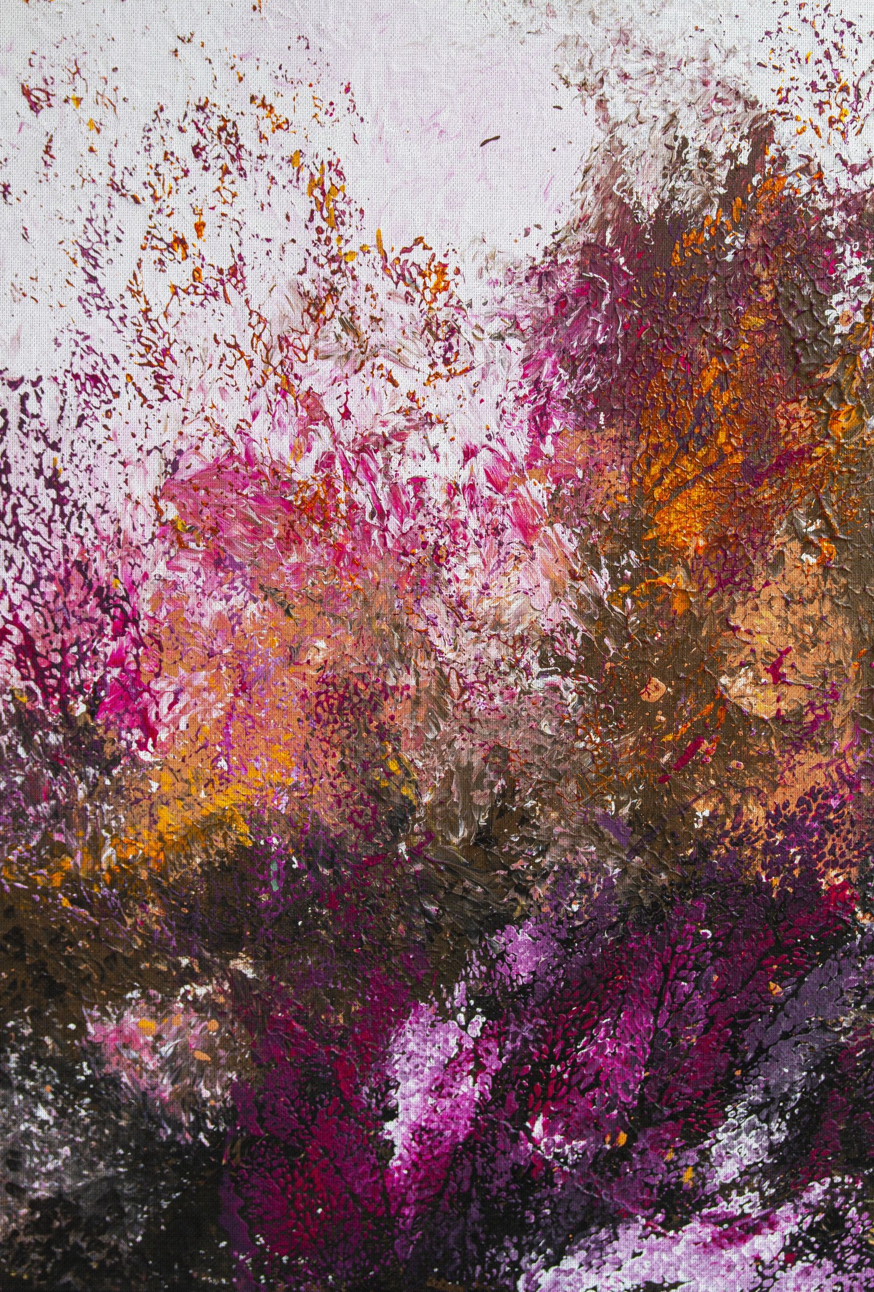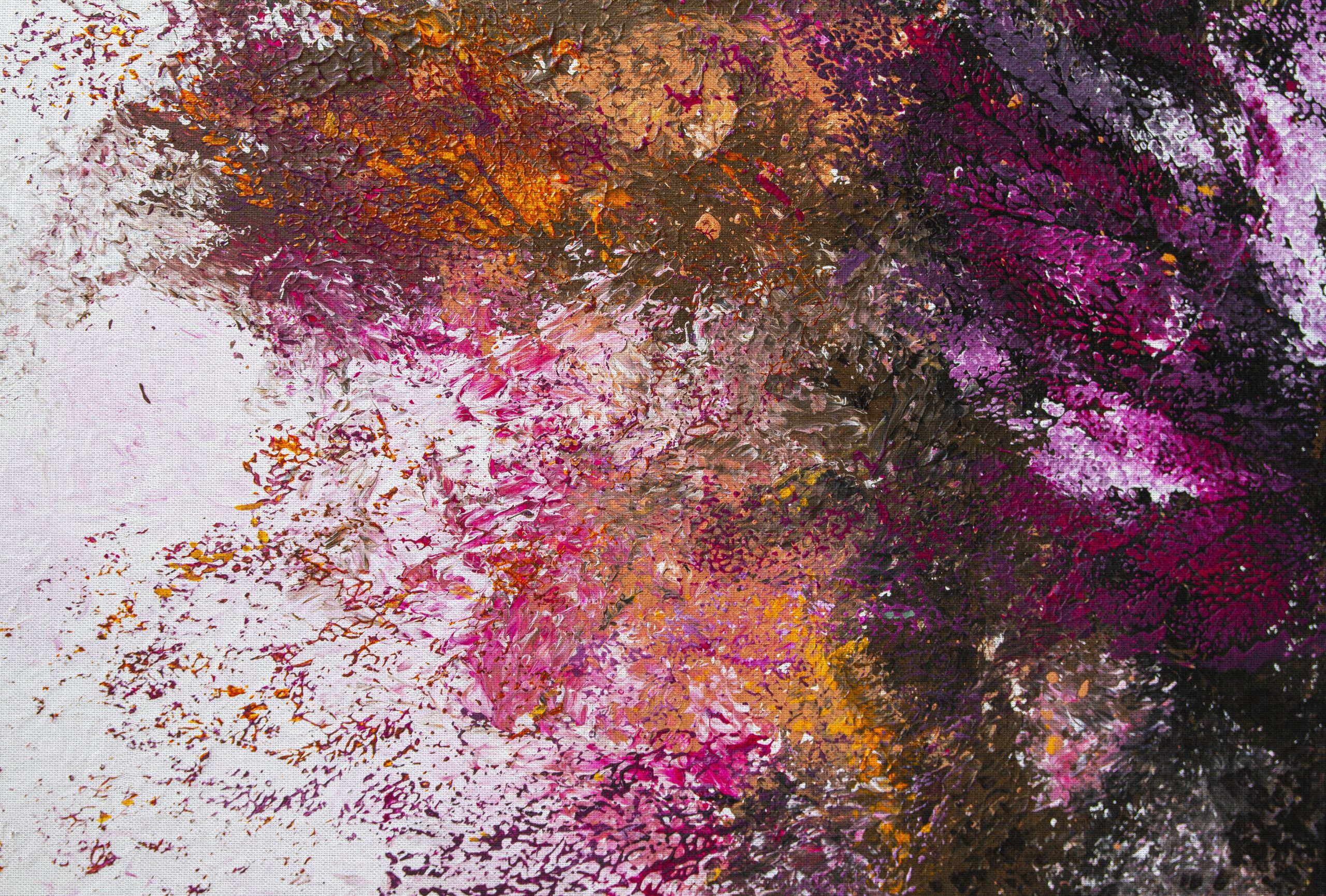Wyobraź sobie eksplozję kolorów, która ozdabia Twoją ścianę. Tapeta Malice zamienia każdy pokój w prywatną galerię. To doskonały przykład abstrakcyjnego ekspresjonizmu, gdzie dynamiczne pociągnięcia pędzla i rozpryski farby tworzą energetyczną kompozycję. Żyje ona światłem i kolorami. Paleta barw jest odważna i zróżnicowana: intensywne róże, fuksje i purpury są przełamane akcentami pomarańczowymi i żółtymi, a całość osadzona na jasnym, niemal białym tle o subtelnej fakturze płótna. Głębsze brązy i ciemne fiolety dodają kontrastu oraz wrażenia głębi, jakbyś oglądał obraz z bliska.