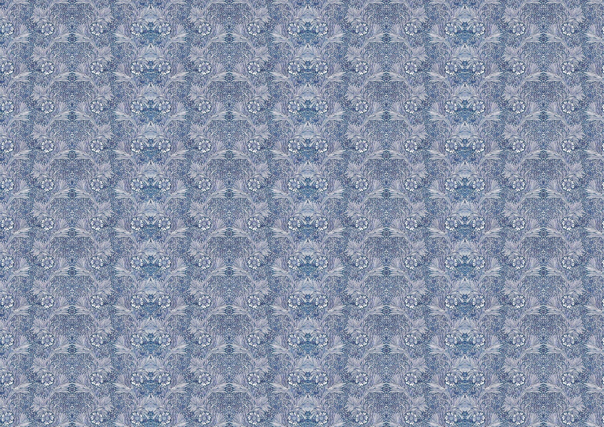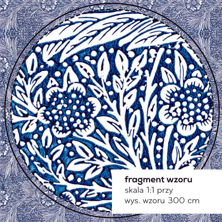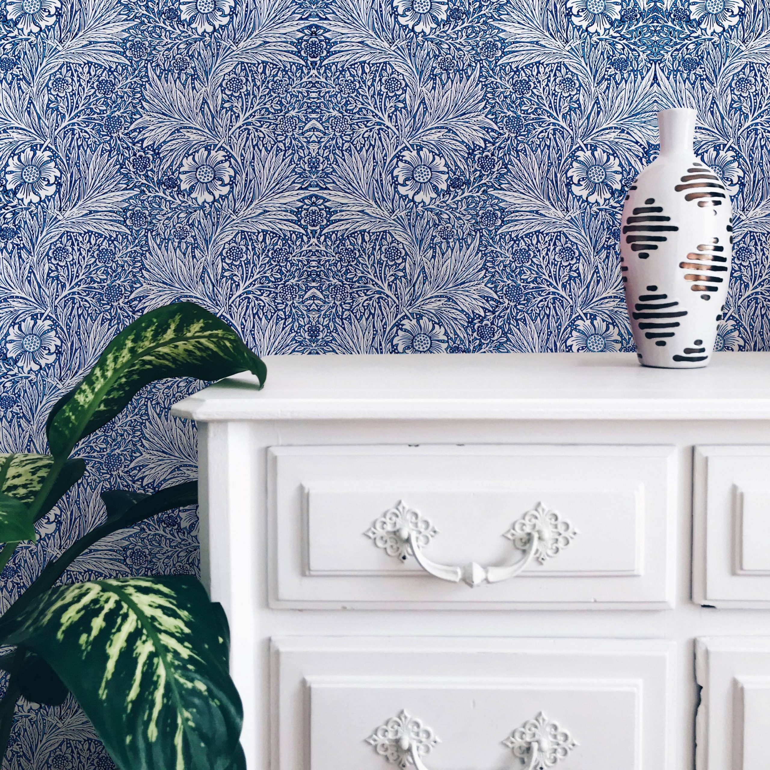 Otwórz drzwi do wnętrza z duszą. Tapeta Marigold to hołd dla klasyki Arts & Crafts. Głęboki kobaltowo-indygo stanowi tło dla misternie rysowanych, śnieżnobiałych motywów botanicznych. Gęsta kompozycja kwiatów o pełnych płatkach, pnączy i liści tworzy niemal gobelinową teksturę. Rytm i symetria harmonijnie prowadzą oko. Efekt? Elegancja i luksus bez ostentacji – wyrafinowany spokój, który wypełnia przestrzeń.