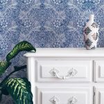 Głębokie kobaltowo-indygo tło z misternymi, białymi motywami botanicznymi. Gęsty, symetryczny wzór o matowym wykończeniu - eleganckie, ponadczasowe tło do salonu, sypialni i gabinetu....