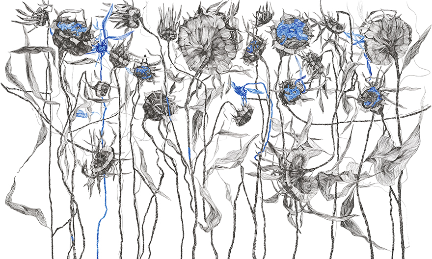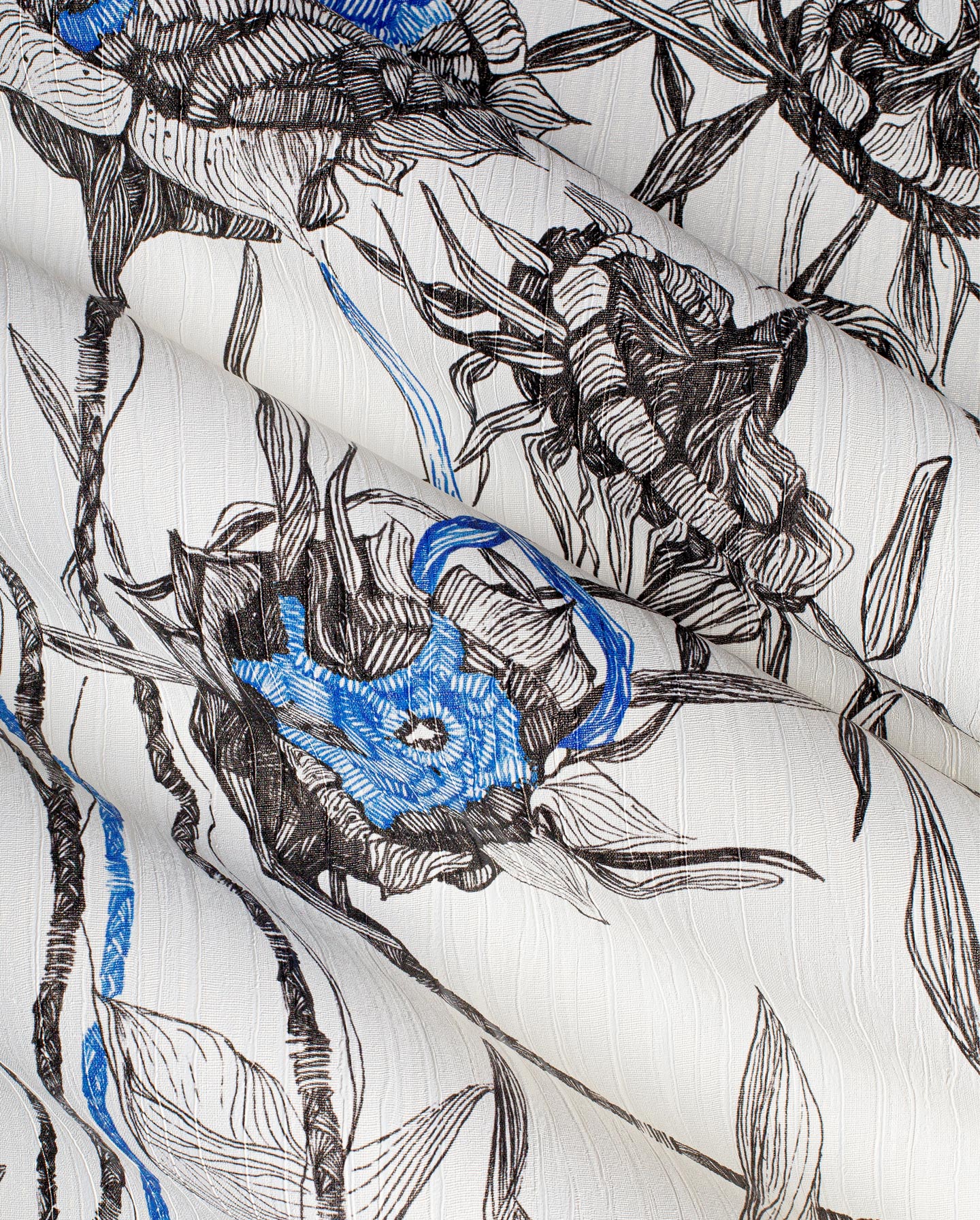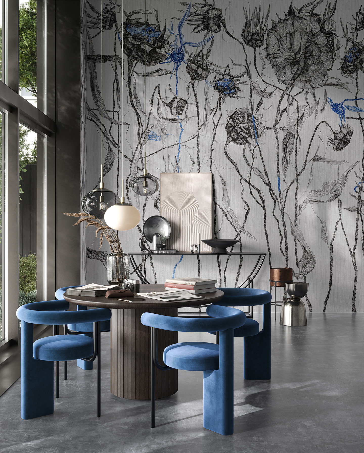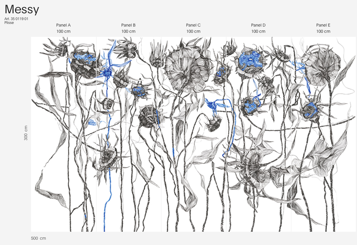 Tapeta Messy to odważna i dynamiczna kompozycja, która balansuje na granicy sztuki współczesnej i ilustracji botanicznej. Rysunkowe, nieregularne kontury kwiatów i łodyg tworzą ekspresyjny układ – pozornie chaotyczny, a zarazem głęboko przemyślany. Akcenty intensywnego kobaltu ożywiają całość, nadając tapecie artystycznego pazura i nowoczesnego charakteru.