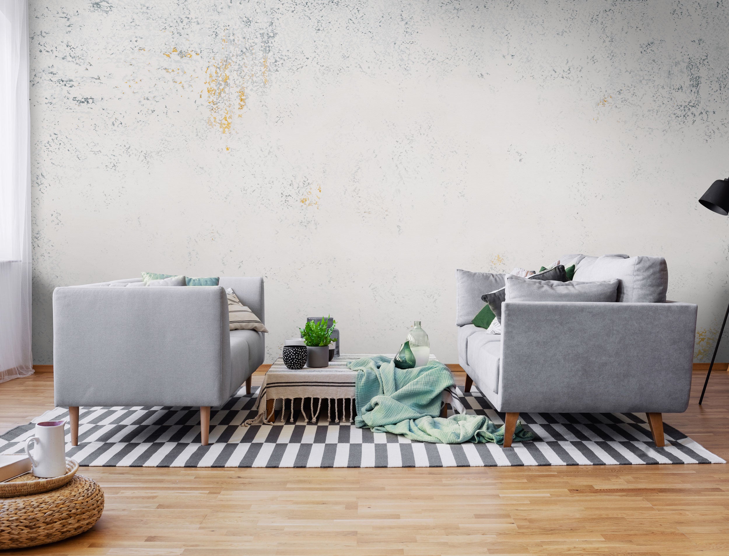 Tapeta Moods to wizualna opowieść o nowoczesnej elegancji z nutą industrialnego stylu. Na tle bardzo jasnej, lekko złamanej bieli, rozgrywa się subtelna gra nieregularnych plam i zacieków w odcieniach szarości oraz chłodnego błękitnoszarego. Wzór przełamują migotliwe, złote akcenty, przypominające dotknięcia mosiądzu. Kompozycja jest konsekwentnie abstrakcyjna – nie ma w niej powtarzalnych modułów, a całość prezentuje się jak jednolita, organiczna tekstura. Przywodzi na myśl szlachetnie postarzoną powierzchnię tynku lub betonu.