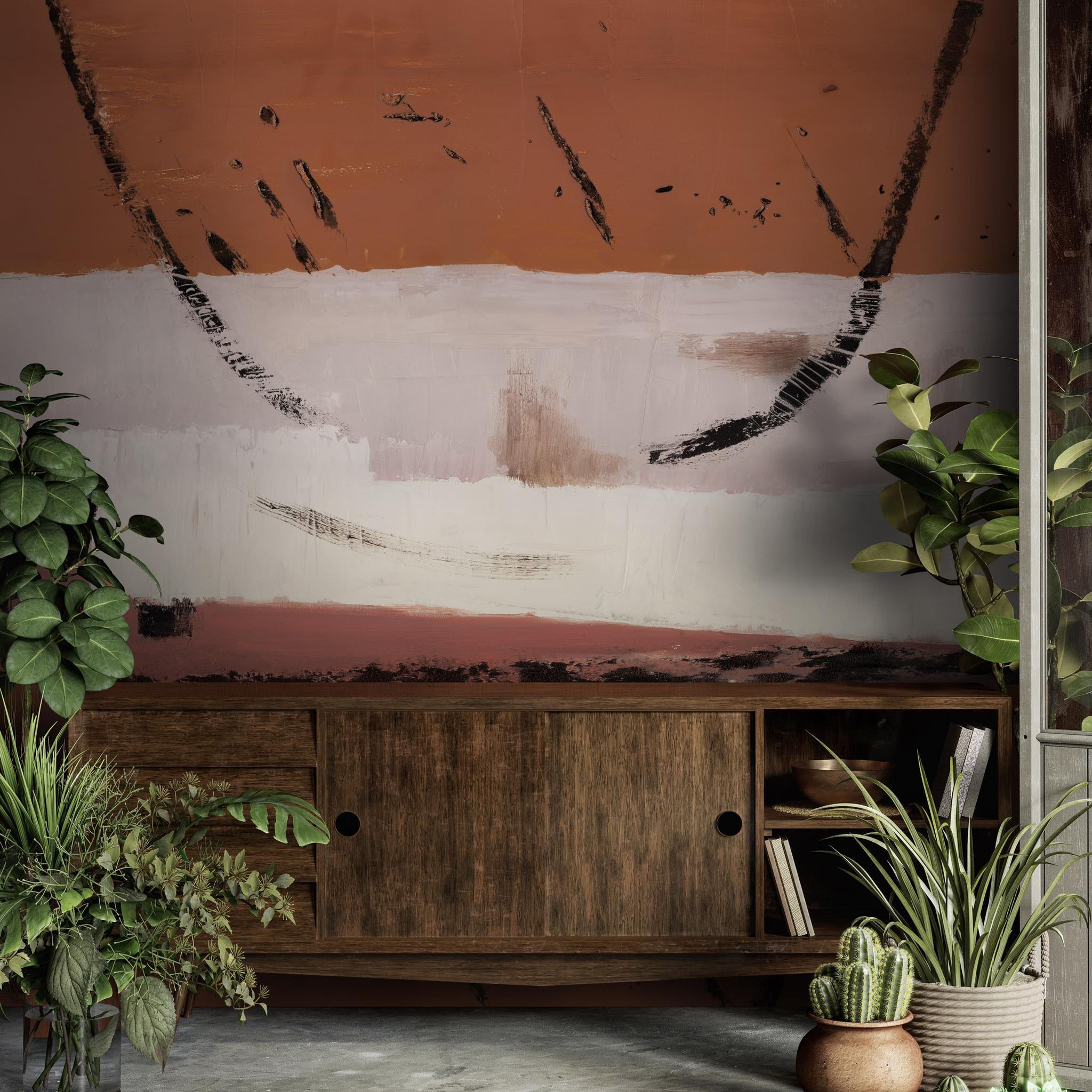 Wyobraź sobie, że jedna ze ścian w Twoim domu staje się wielkim obrazem. Ciepła terakota i rdzawy brąz płynnie przechodzą w kremowe, beżowe oraz subtelne szarości. Na koniec wszystko zyskuje zgaszony różowo-śliwkowy ton. Tapeta Nocciola to mural inspirowany abstrakcyjnym ekspresjonizmem. Odważne, niemal kaligraficzne, czarne pociągnięcia pędzla nadają kompozycji rytm oraz wyrafinowaną dynamikę.