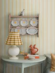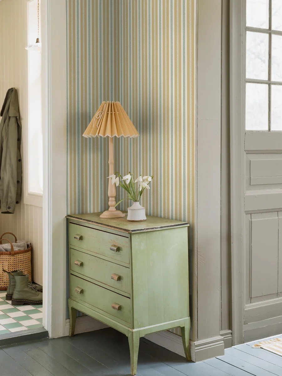 Wnieś odrobinę słońca do swojej przestrzeni dzięki tapecie Hedda zaprojektowanej przez Jenny Hahne Gadd. Ta tapeta z nadrukiem powierzchniowym ma klasyczny wzór pasków w delikatnych żółtych odcieniach z akcentami zieleni....