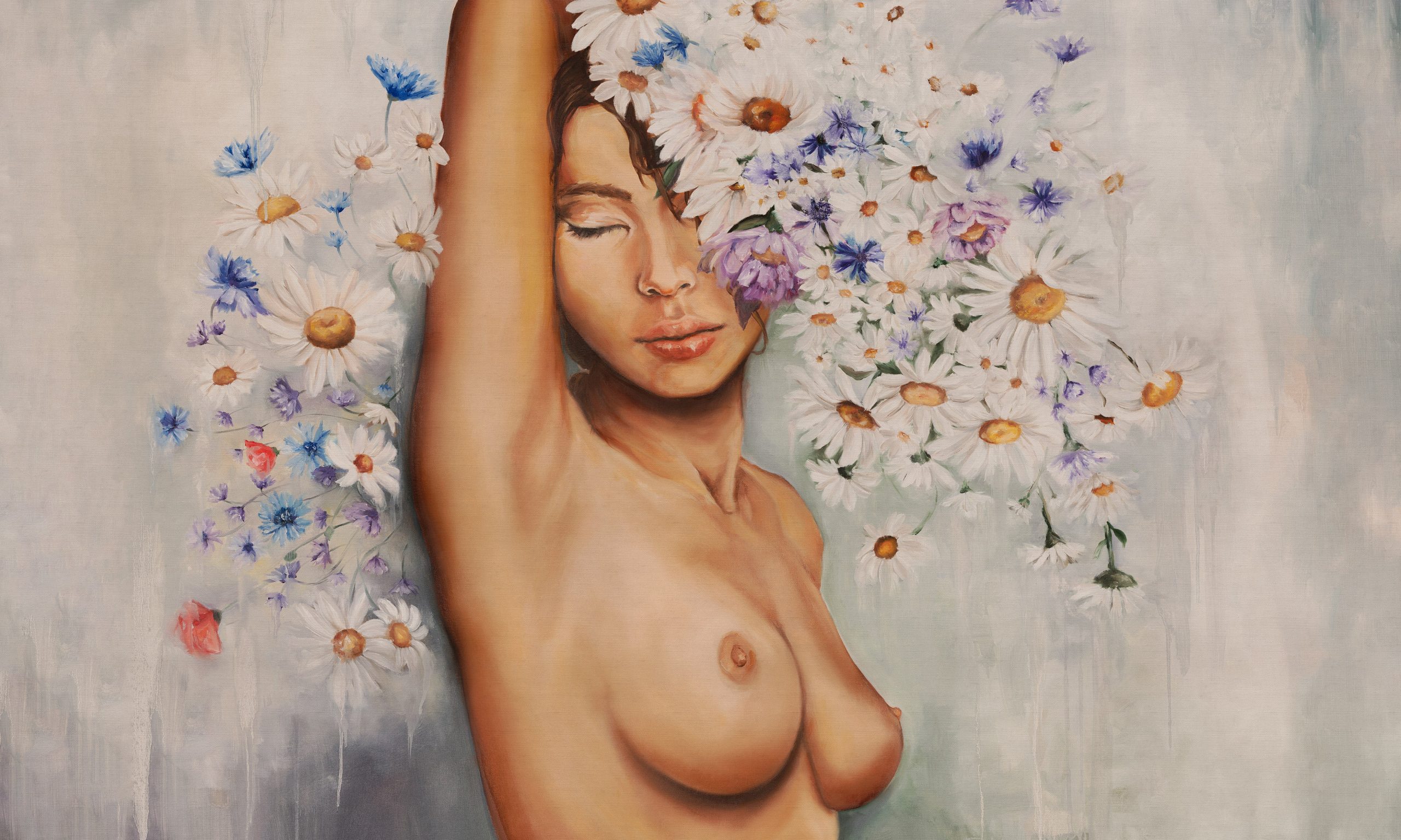 Wyobraź sobie ścianę, która przemienia się w cichy poranek na letniej łące. Tapeta Nymph to wielkoformatowy mural, który zachwyca swoją niepowtarzalną kompozycją. Malarski portret kobiety z zamkniętymi oczami subtelnie wyłania się z gęstych, białych stokrotek, które są akcentowane lawendowym i chabrowym kolorem. Chłodne, szaroniebieskie tło wprowadza lekkość, podczas gdy ciepłe brzoskwiniowo-beżowe tony skóry oraz złocisto-miodowe środki kwiatów nadają całości miękkości oraz harmonii.