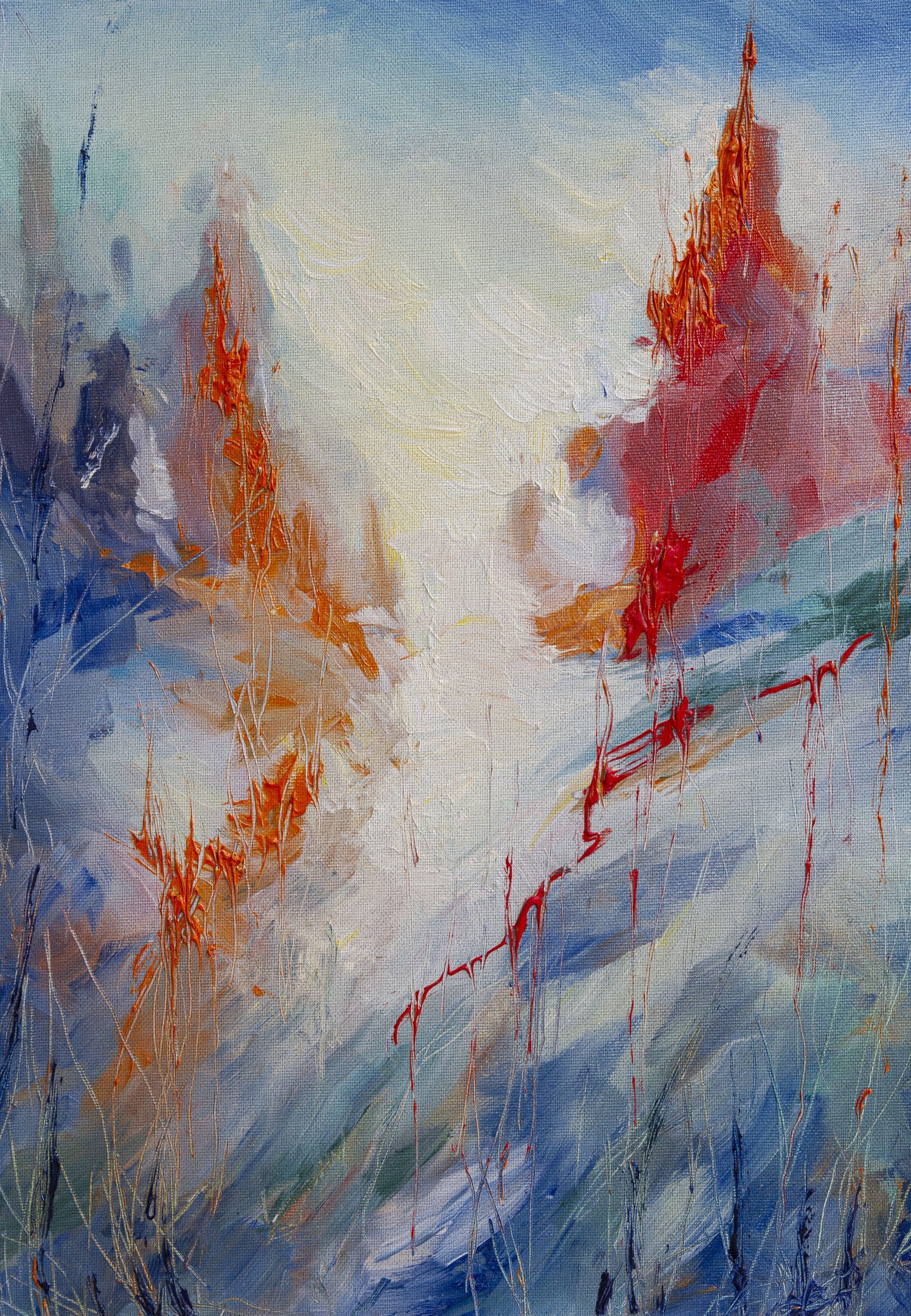 Wyobraź sobie ścianę, która zamienia się w płótno. Tapeta Passage przekształca wnętrze w prywatną galerię sztuki. To ekspresyjna abstrakcja w dużym formacie, gdzie szerokie, swobodne pociągnięcia pędzla oraz impasto tworzą bogatą fakturę i głębię obrazu. Jasne odcienie bieli i kremu wprowadzają światło, podczas gdy akcenty spalonej pomarańczy, terakoty, intensywnego błękitu i indygo, z dodatkiem żółci i czerwieni, ożywiają przestrzeń i wprowadzają harmonijny kontrast.