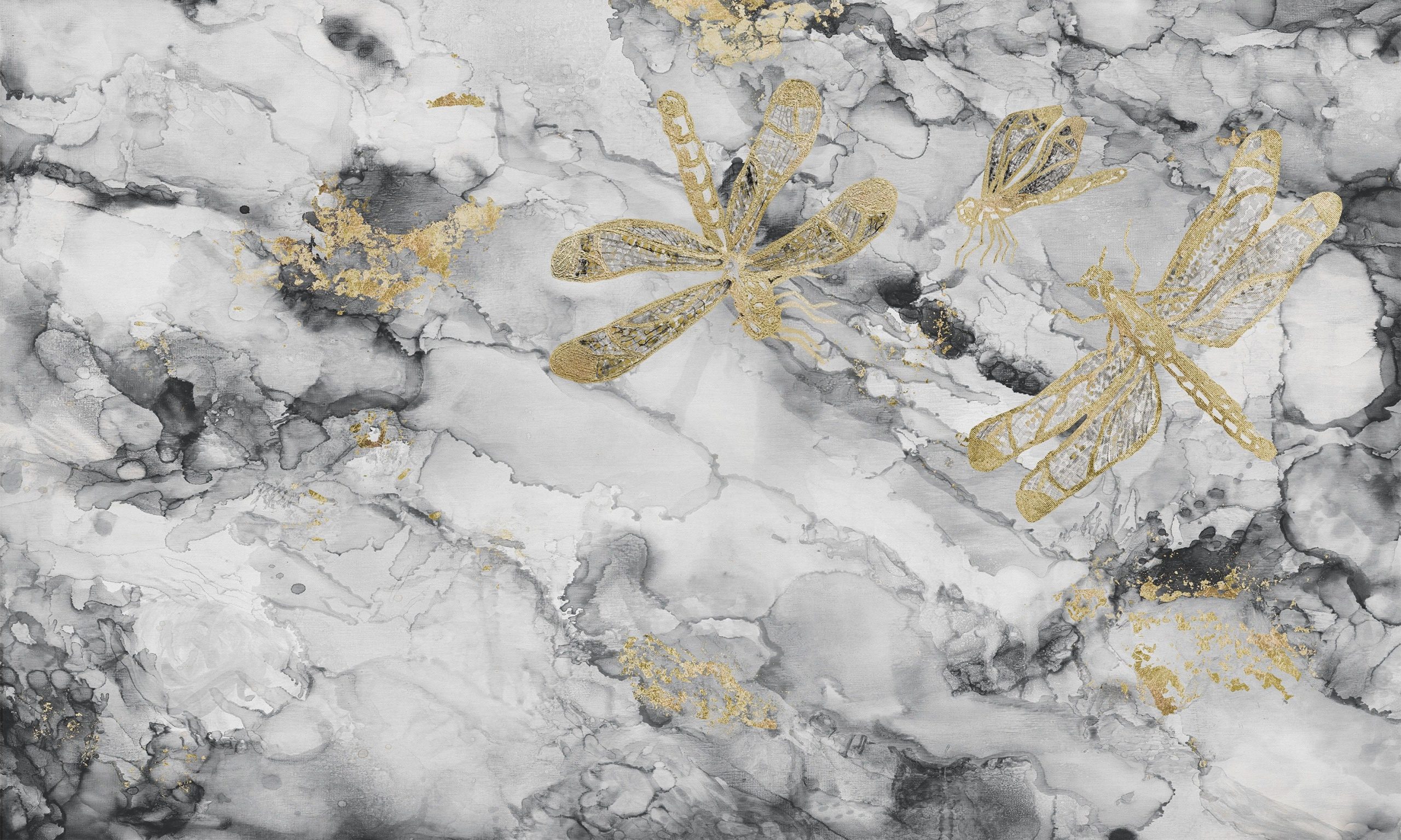 Tapeta Portafortuna B&W zamienia ścianę w nastrojowe, nowoczesne dzieło sztuki. Na miękko rozmytym tle w odcieniach mgły i antracytu unoszą się złotem zarysowane ważki. Półprzezroczyste skrzydła łączą się z żyłkowaniem przypominającym marmur. Delikatny, metaliczny połysk akcentów dodaje całości luksusowego blasku. Efekt jest zarówno kojący, jak i energetyczny. To idealny sposób na stworzenie atmosfery wyrafinowanego spokoju z artystycznym akcentem.