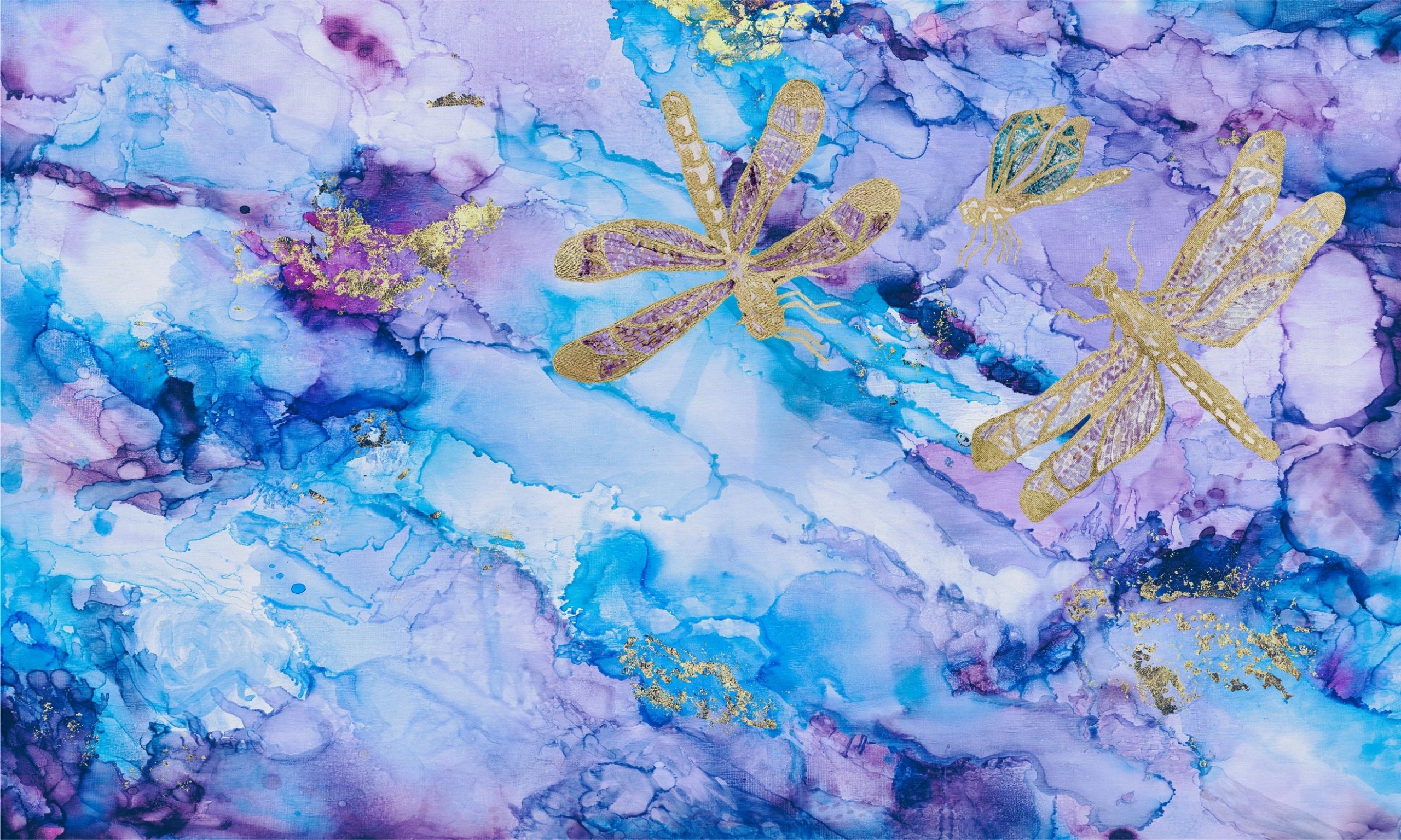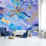 Tapeta Portafortuna to mural, który zmienia całą ścianę w piękne dzieło sztuki. Jej płynna kompozycja w odcieniach błękitu i fioletu – od turkusowych tonów po głęboki granat i purpurę – błyszczy eleganckimi złotymi akcentami. Misternie stylizowane ważki z ażurowymi skrzydłami dodają całości lekkości i naturalnego wdzięku. Przypomina to fluid art, subtelny marmur oraz świetliste chmury o poranku.