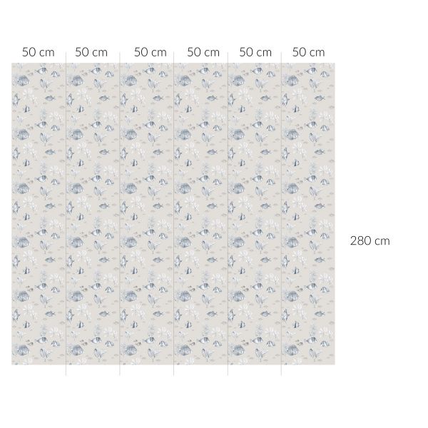 Tapeta jest podzielona na pasy (bryty). Wymiar 1 brytu: Wysokość: 280 cm Szerokość: 50 cm Elementy na tapecie są niewielkie, np. rybki skalary mają 15 cm wysokości, reszta rybek nie...