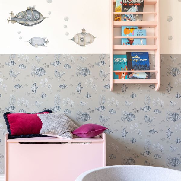Elementy na tapecie są niewielkie, np. rybki skalary mają 15 cm wysokości, reszta rybek nie przekracza 10 cm.
