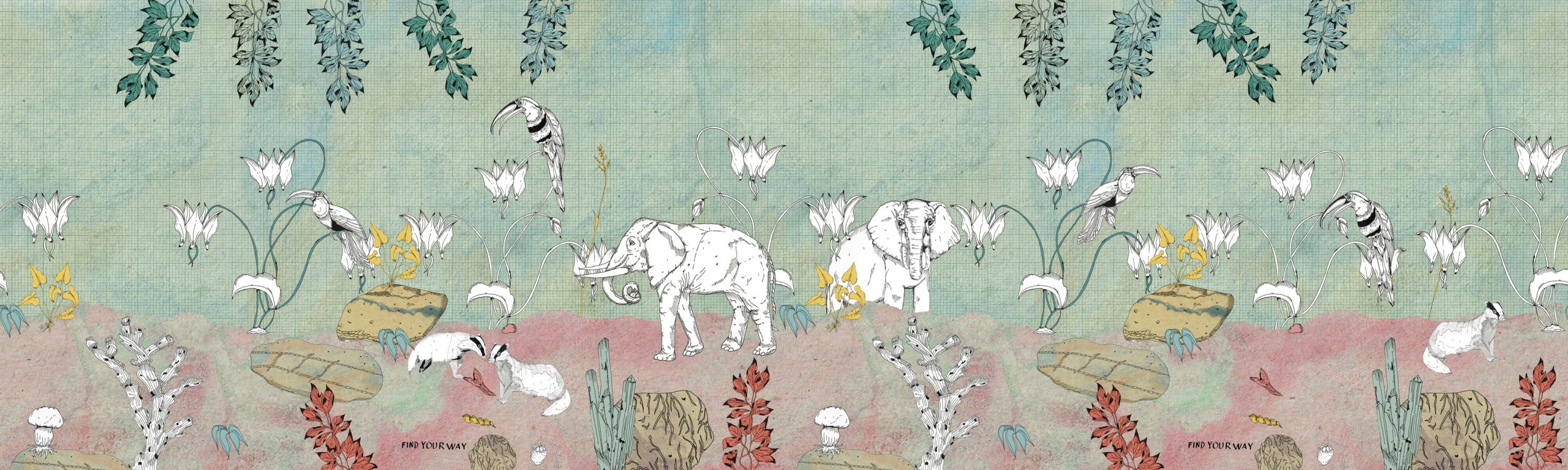 Geometryczna kratka łączy się tu z narracyjnymi ilustracjami. Na przykład pojawiają się słoń, tukan, borsuk i dekoracyjne drzewa. Razem tworzą metaforę świata, w którym zwierzęta uczą się żyć wśród roślin rosnących ponad miarę.