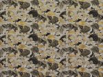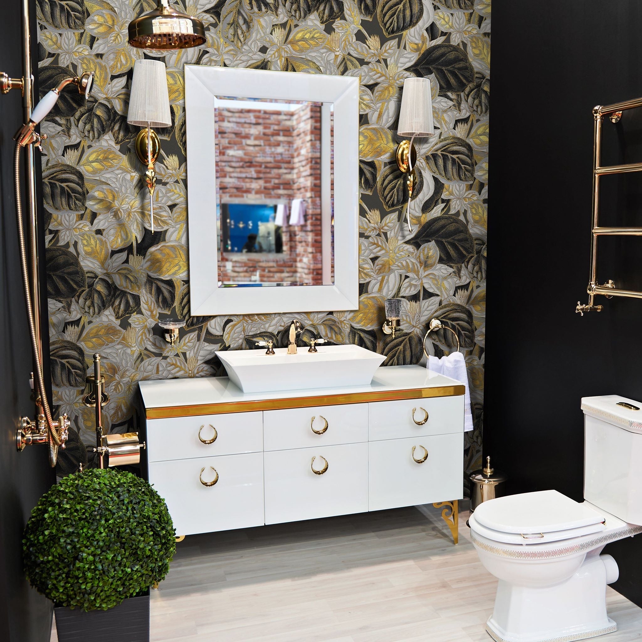 Tapeta Splendor to kwintesencja nowoczesnego luksusu. Ciemny, grafitowy horyzont tła w połączeniu z pulsującym rytmem tropikalnych liści, których złociste akcenty subtelnie odbijają światło, tworzy wyjątkowy efekt. Gęsta i wielowarstwowa kompozycja roślin przypomina bujny ogród. Jednocześnie jej styl nawiązuje do vintage’owych ilustracji i jest dopracowany w duchu art déco. Czarne oraz bardzo ciemne szarości kontrastują z mosiężno-złotym blaskiem, a jasne obrysy nadają ścianie głębi i teatralnego wyrazu.