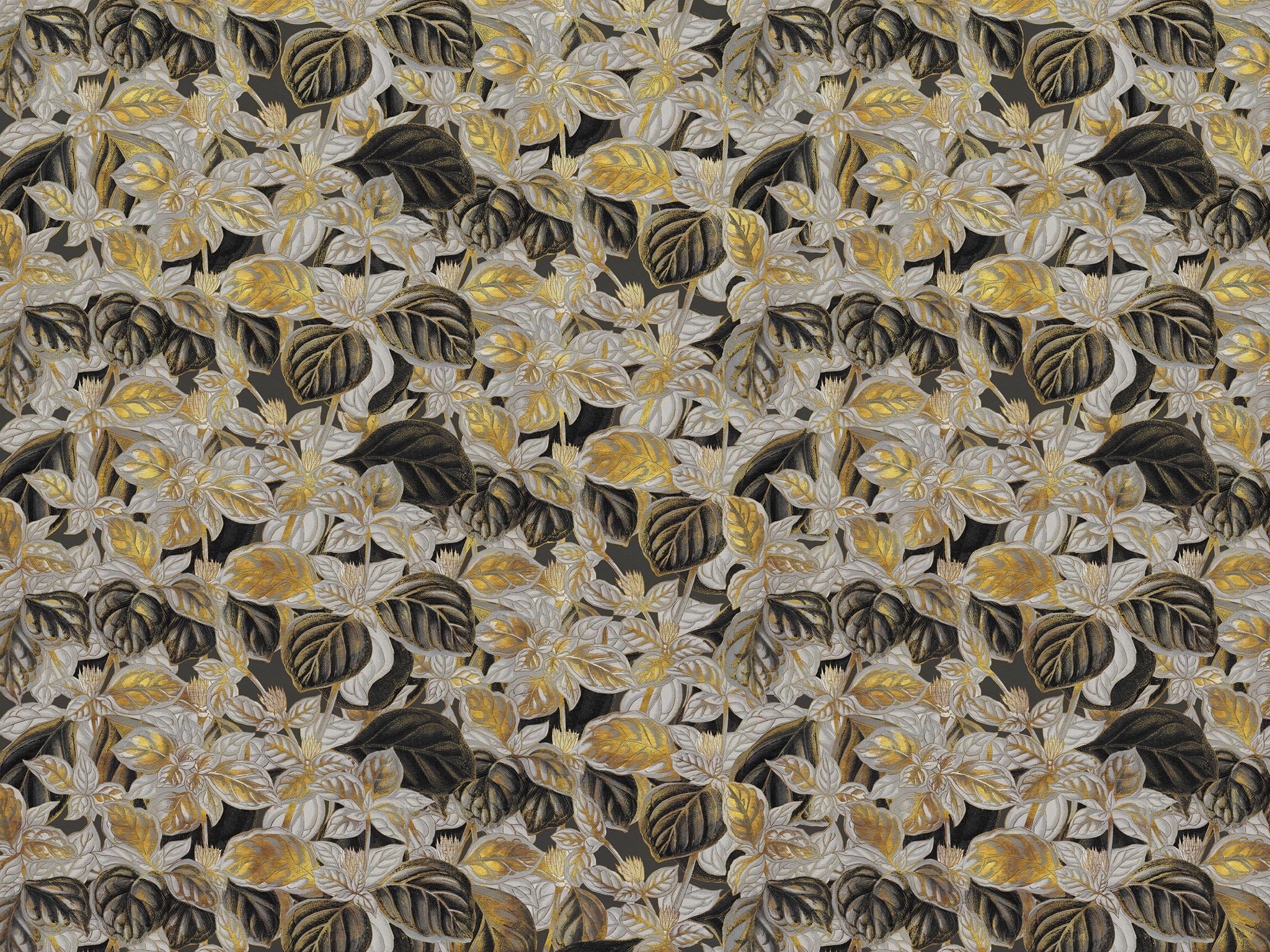 Docenisz tę tapetę za precyzyjny nadruk. Żiłkowanie liści, delikatne kontury oraz miękkie światłocienie tworzą trójwymiarowy efekt bez ciężkości. Choć wzór regularnie się powtarza, całość sprawia wrażenie swobodnego, ręcznie malowanego muralu. Połączenia są dyskretne, a rytm wzoru harmonijny i płynny. Matowe tony grafitu idealnie komponują się z metalicznym blaskiem złota, co pięknie współgra zarówno z naturalnym światłem, jak i wieczorną iluminacją.