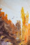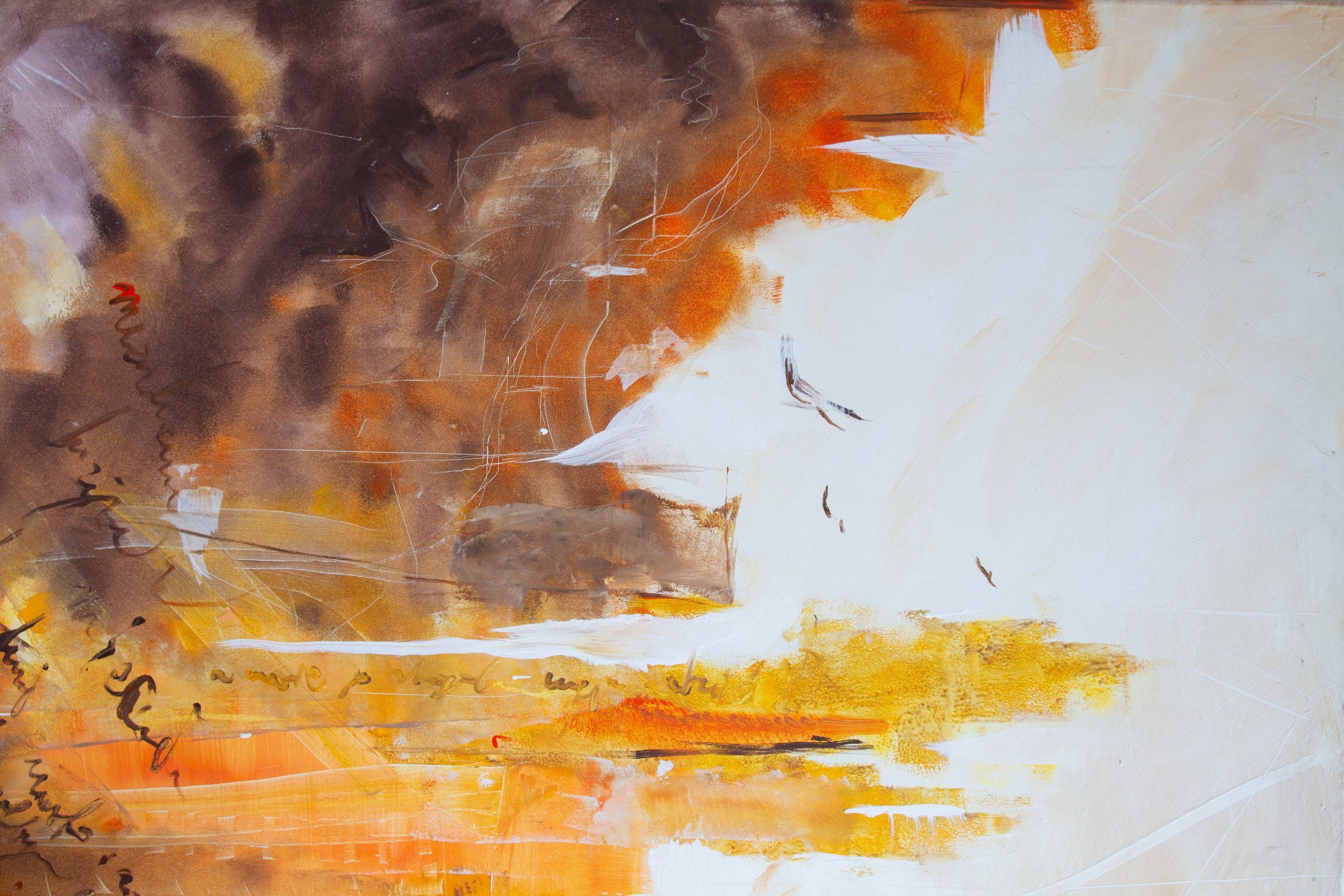 Duża, unikatowa kompozycja w duchu abstrakcyjnego ekspresjonizmu; intensywna paleta kolorów pomarańczowych, rudych i bieli z metalicznymi akcentami złota, srebra, miedzi. Punkt aranżacyjny, modny klimat....