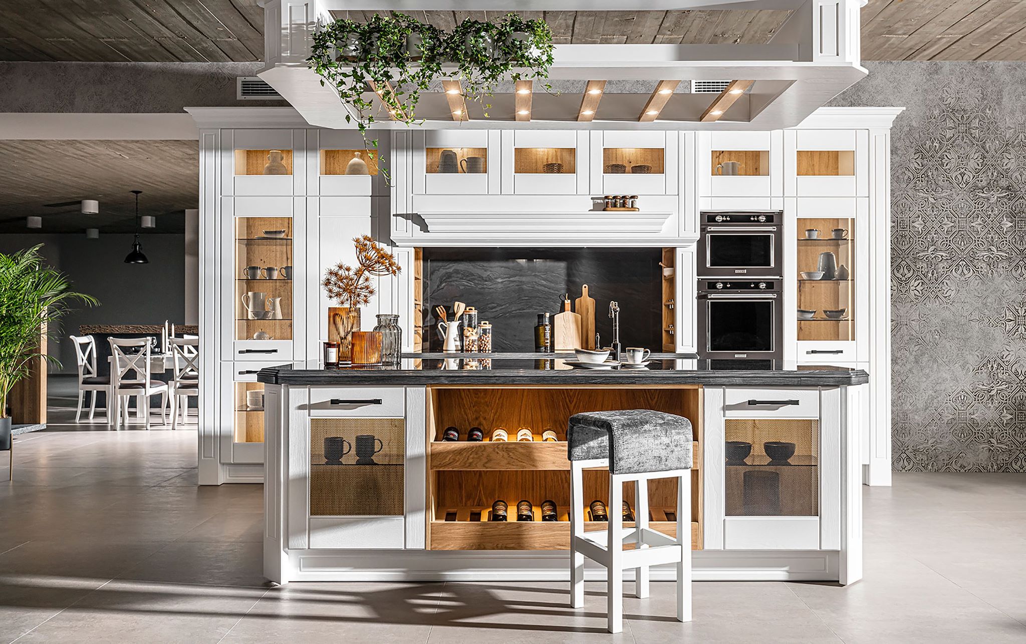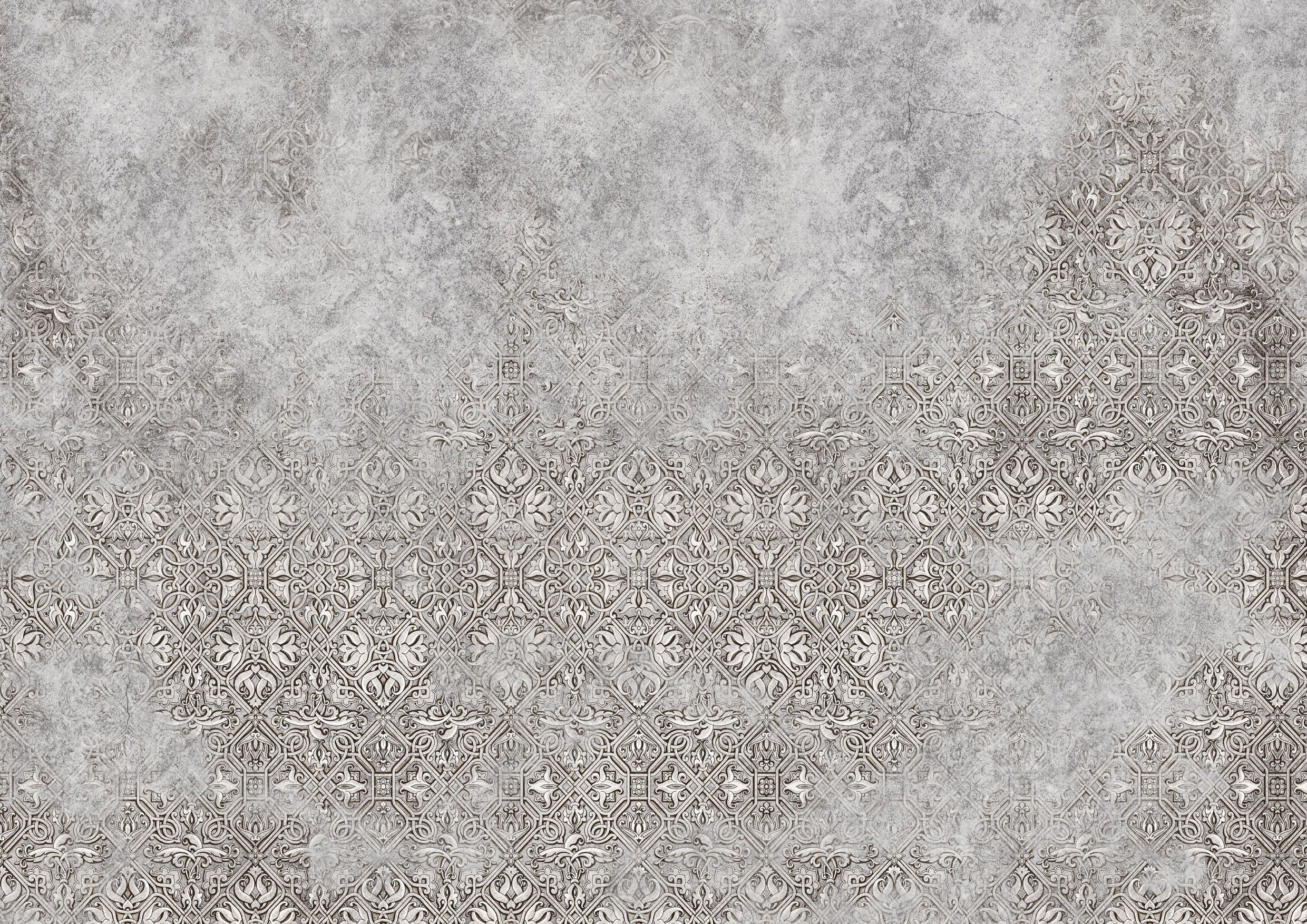 Tapeta Temptation to wprowadzenie do świata elegancji, przypominającej pałacowy styl. Wyobraź sobie ścianę, która zachowała ducha minionych epok, wciąż fascynując szlachetną patyną. Niejednorodne tło w zgaszonych szarościach, od kredowych po antracytowe odcienie, nawiązuje do faktury starego tynku i kamienia. Na tym tle wyłania się skomplikowany ornament: siatka rombów i elips, ozdobiona arabeskami, liśćmi i drobnymi medalionami, rysowana w odcieniu brązowo-szarym taupe. Choć rytm wzoru jest klasyczny, postarzone wykończenie nadaje mu intrygującej miękkości oraz subtelnego dramatyzmu.