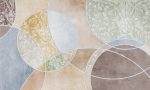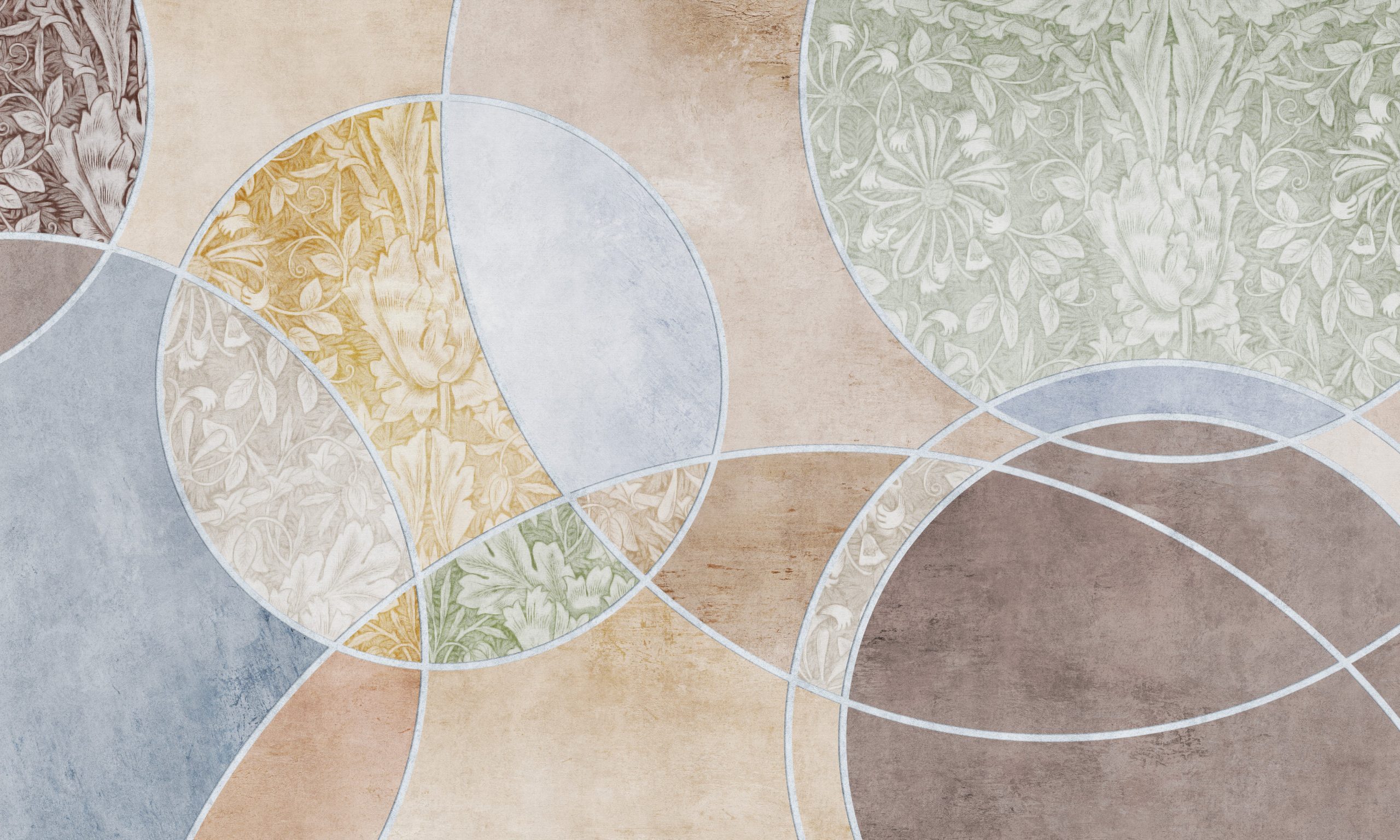 Paleta kolorów jest stonowana. Zawiera beże, ciepłe szarości, taupe, blade oliwki i przydymione błękity. Tworzy to atmosferę spokoju i luksusu. Jasne, niemal białe linie graniczne dodają lekkości, porządkując przestrzeń wizualnie. Rytm wzoru jest harmonijny i niepowtarzalny. To nie jest typowa tapeta, ale pełnowymiarowe dzieło sztuki, które zamienia ścianę w galeryjny panel.