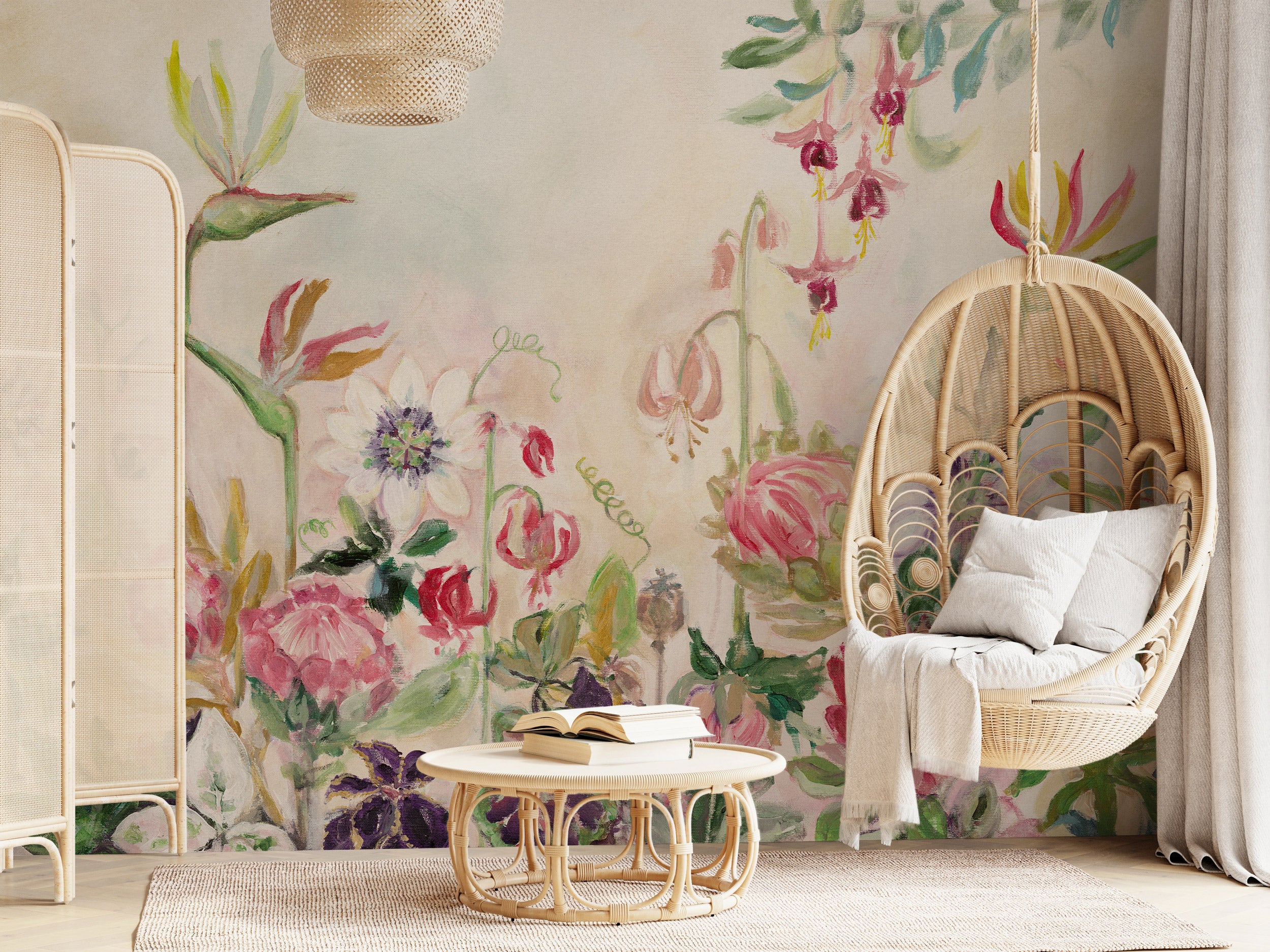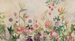 Otwórz drzwi do swojego prywatnego ogrodu. Tapeta Tutti Frutti przedstawia malarską, botaniczną opowieść. Na delikatnym, kremowo-beżowym tle rozkwitają piwonie, fuksje i passiflory, zarysowane impresjonistycznymi pociągnięciami pędzla. Paleta kolorów obejmuje ciepłe róże, fuksję i karmazyn, a także świeże zielenie szałwii oraz jaśniejsze szmaragdy z nutą turkusu. W centrach kwiatów pojawiają się głębokie fiolety oraz subtelne akcenty złocistego żółtego. Całość ma charakter wielkoformatowego muralu – płynnego, bez powtarzających się wzorów – przez co ściana staje się jedną, wciągającą kompozycją.
