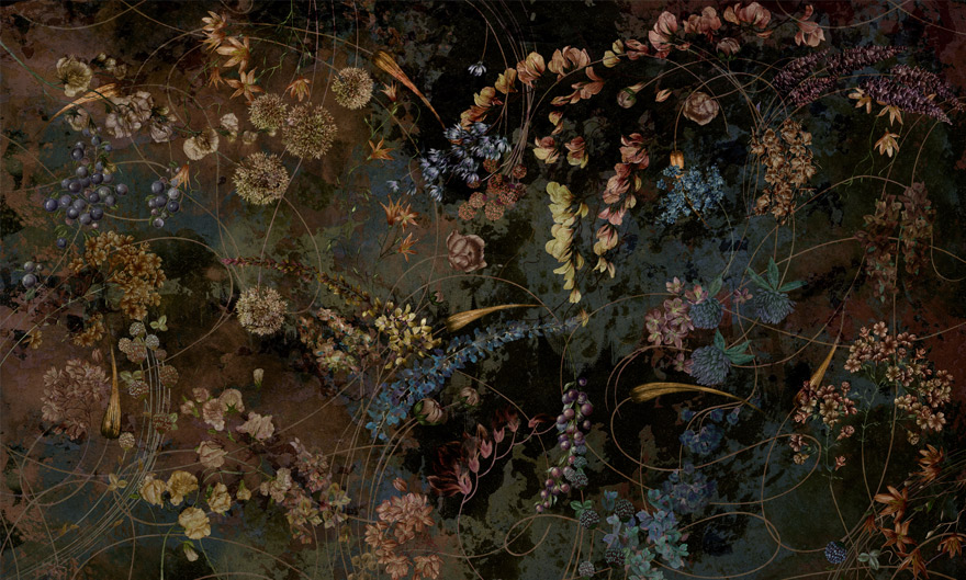 Na głębokim, czarnym tle subtelnie wyłaniają się kształty przypominające pióra lub liście w delikatnych odcieniach szarości i brązu. Ta nowoczesna kompozycja wnosi oryginalność i lekkość, tworząc atmosferę sprzyjającą relaksowi oraz kontemplacji. Idealnie sprawdzi się w salonach, sypialniach, biurach i przestrzeniach komercyjnych, gdzie potrzebna jest wyjątkowa aranżacja.