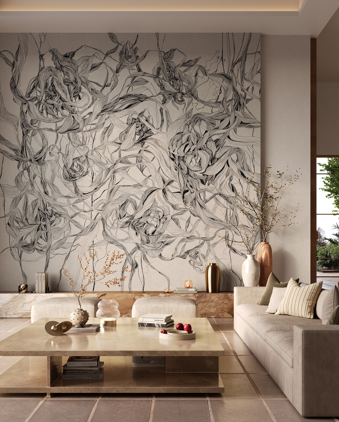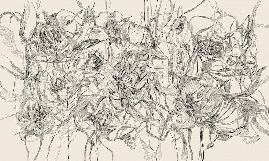 Tapeta Whisper to propozycja dla osób, które kochają sztukę wpisaną w przestrzeń. Ten wyjątkowy wzór to misterny, linearny rysunek inspirowany naturą – plastyczne, organiczne kompozycje przypominają wijące się liście i kwiatowe struktury, tworząc efekt prawdziwego, ręcznie szkicowanego muralu.