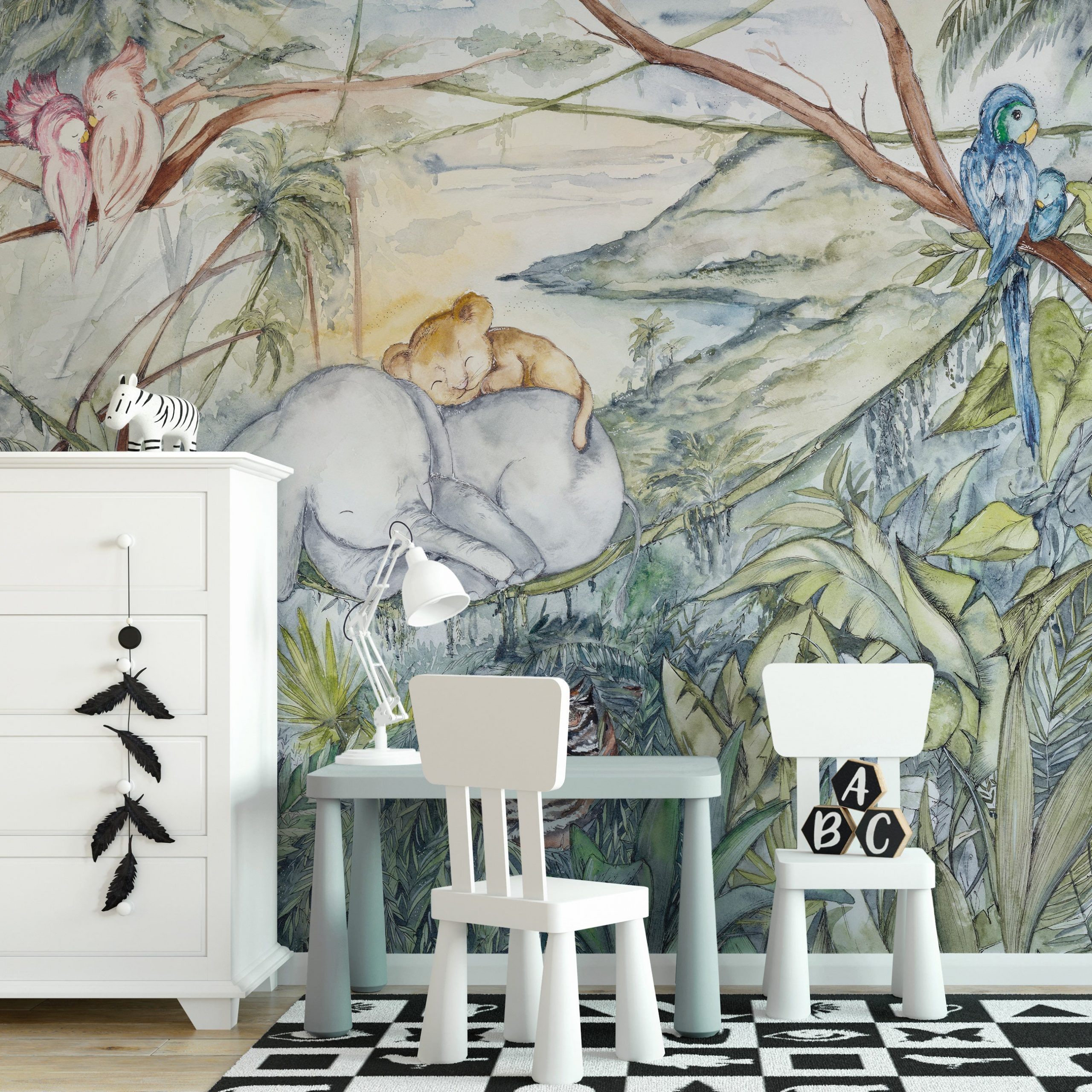 Zamknij oczy i wyobraź sobie krainę zieleni, gdzie słoń drzemie z lwiątkiem na grzbiecie, tygrys czai się w gąszczu, a niebieska papuga patrzy z gałęzi. Tapeta Wild Life zamienia ścianę w nastrojowy, akwarelowy mural. Wypełniają ją miękkie odcienie zieleni, brązy ziemi oraz kremowe akcenty. To spójna, wielkoformatowa kompozycja, która opowiada o dżungli, bliskości i cichej przygodzie, zamiast być jedynie powtarzalnym wzorem.